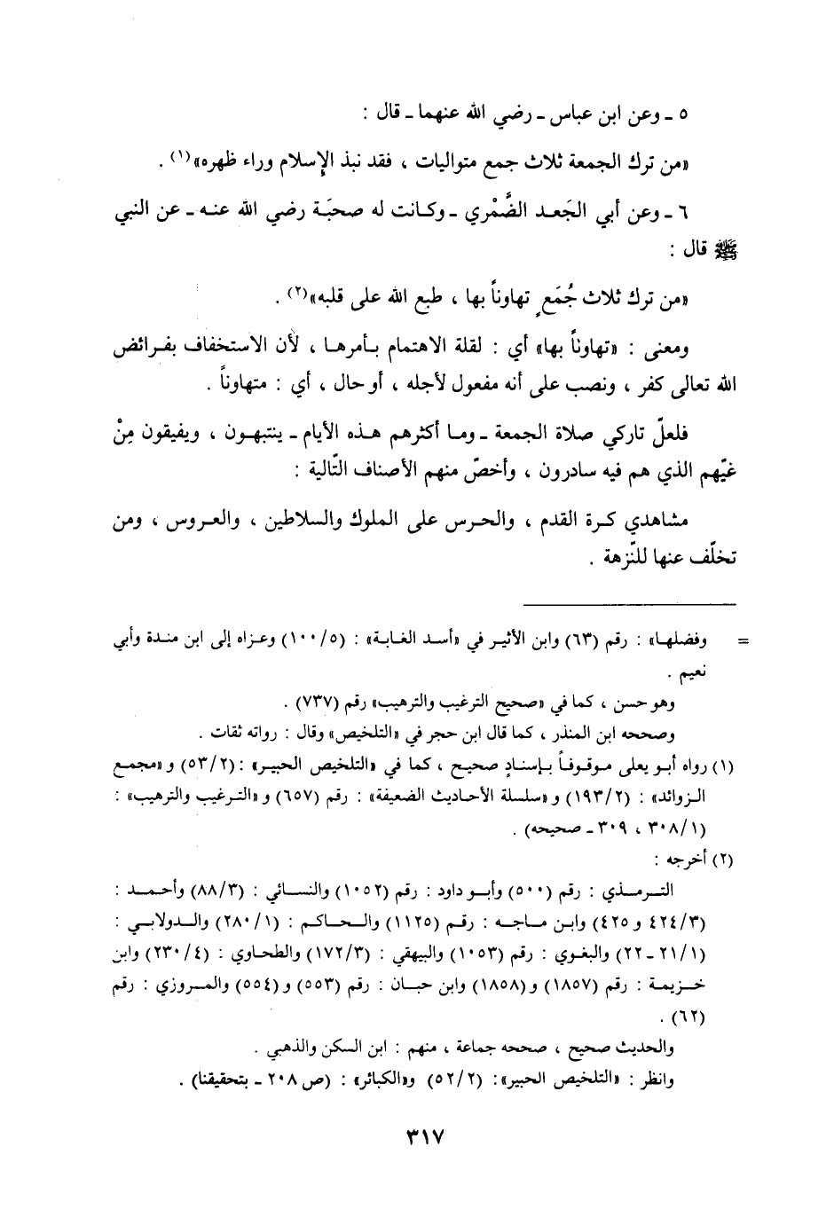 فلعلّ تاركي صلاة الجمعة ـ وما أكثرهم هذه الأيام ـ ينتبهون، ويفيقون مِنْ غيّهم الذي هم فيه سادرون، وأخصّ منهم الأصناف التّالية: مشاهدي كرة القدم، والحرس على الملوك والسلاطين، والعروس، ومن تخلّف عنها للنّزهة.