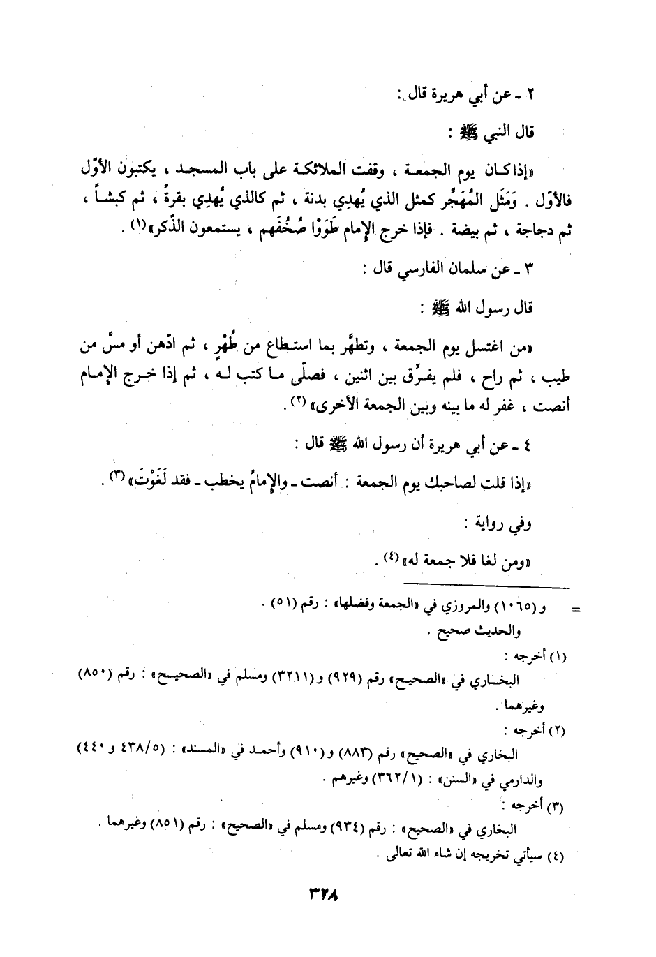 2. عن أبي هريرة قال: قال النبي - صلى الله عليه وسلم -: ((إذا كان يوم الجمعة، وقفت الملائكة على باب المسجد، يكتبون الأوّل فالأوّل. وَمَثلَ المُهَجِّر كمثل الذي يُهدِي بدنه، ثم كالذي يُهدِي بقرةً، ثم كبشاً، ثم دجاجة، ثم بيضة، - فإذا خرج الإمام طَوَوْا صُحُفَهم، يستمعون الذّكر)) (4) .