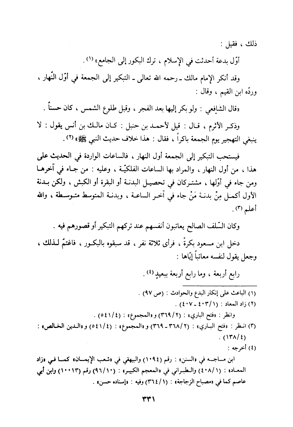 وقد أنكر الإِمام مالك ـ رحمه الله تعالى ـ التبكير إلى الجمعة في أوّل النّهار،وردّه ابن القيم، وقال: قال الشافعي: ولو بكر إليها بعد الفجر، وقبل طلوع الشمس، كان حسناً.