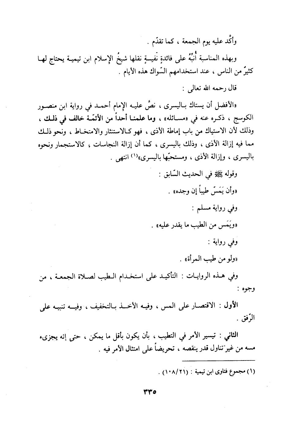 وبهذه المناسبة أُنبِّهُ على فائدةٍ نفسيةٍ نقلها شيخُ الإِسلام ابن تيمية يحتاج لها كثيرٌ من الناس، عند استخدامهم السّواك هذه الأيام.