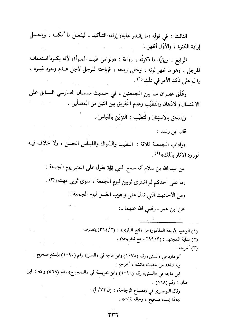 قال ابن رشد: ((وآداب الجمعة ثلاثة: الطيب والسّواك واللباس الحسن، ولا خلاف فيه لورود الآثار بذلك)) (2) .