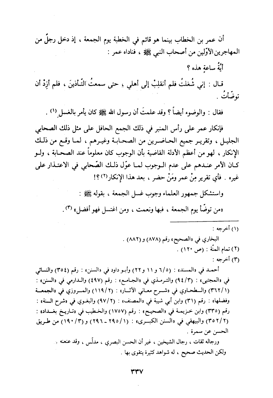فإنكار عمر على رأس المنبر في ذلك الجمع الحافل على مثل ذلك الصحابي الجليل، وتقرير جميع الحاضرين من الصحابة وغيرهم، لما وقع من ذلك الإِنكار،لهو من أعظم الأدلة القاضية بأن الوجوب كان معلوماً عند الصحابة، ولو كان الأمر عندهم على عدم الوجوب لما عوّل ذلك الصّحابي في الاعتذار على غيره. فأي تقرير مِنْ عمر ومَنْ حضر، بعد هذا الإنكار (5) ؟!