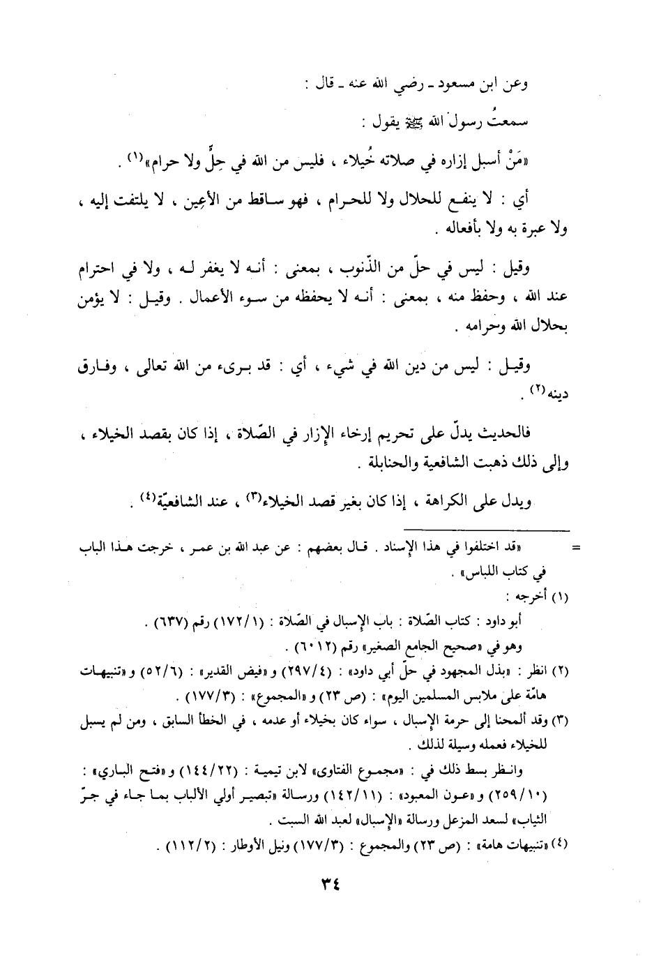 وانظر بسط ذلك في: ((مجموع الفتاوى)) لابن تيمية: (22/144) و ((فتح الباري)) : (10/259) و ((عون المعبود)) : (11/142) ورسالة ((تبصير أولي الألباب بما جاء في جرّ الثياب)) لسعد المزعل ورسالة ((الإسبال)) لعبد الله السبت.