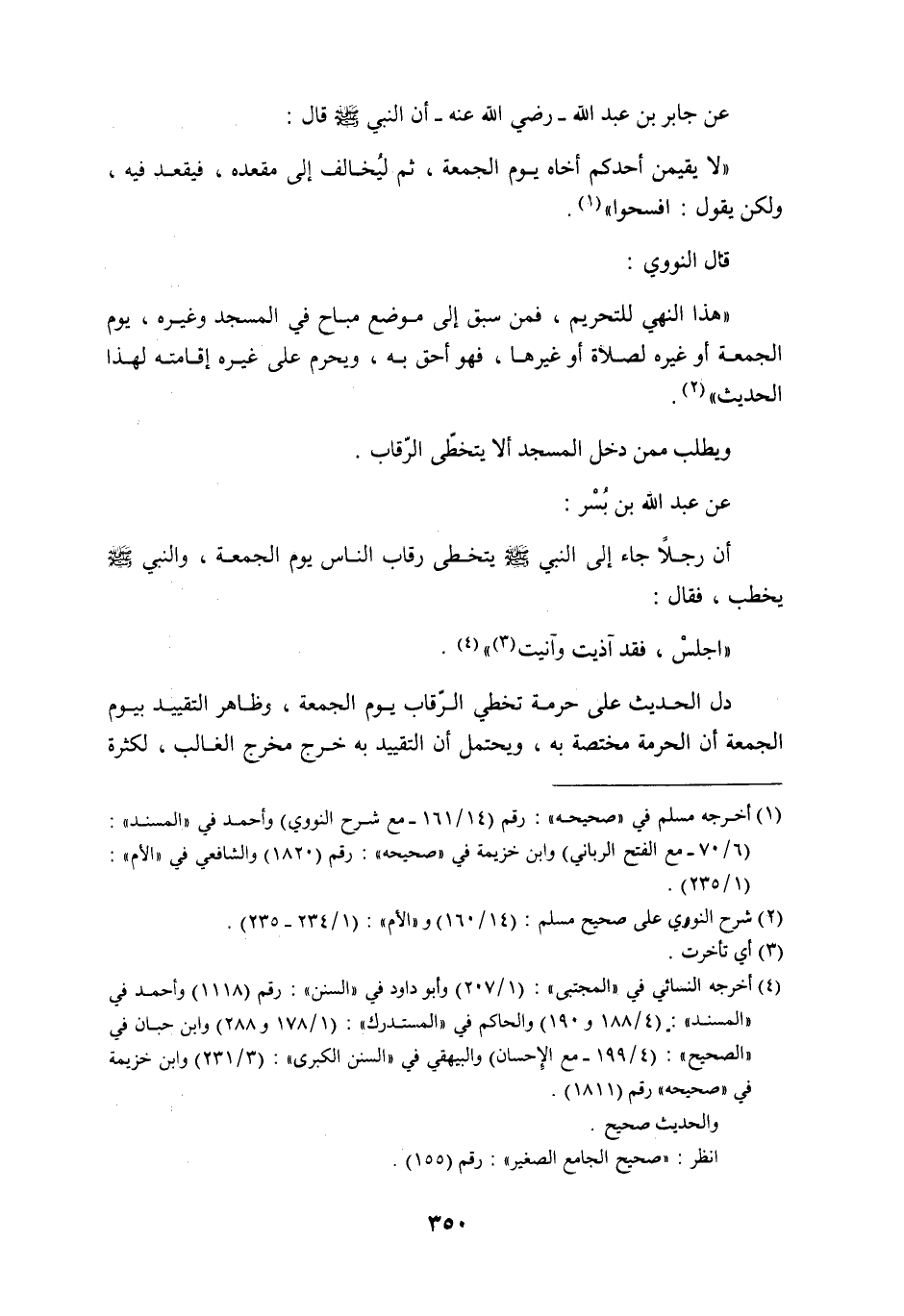 عن جابر بن عبد الله ـ رضي الله عنه ـ أن النبي - صلى الله عليه وسلم - قال: ((لا يقيمن أحدكم أخاه يوم الجمعة، ثم ليُخالف إلى مقعده، فيقعد فيه، ولكن يقول: افسحوا)) (1) .