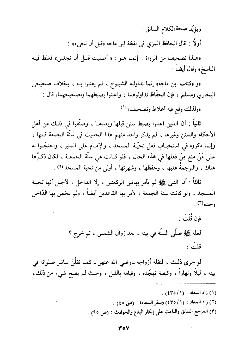 ثانياً: أن الذي اعتنوا بضبط سنن قبلها وبعدها، وصنّفوا في ذلك من أهل الأحكام والسنن وغيرها، لم يذكر واحد منهم هذا الحديث في سنّة الجمعة قبلها، وإنما ذكروه في استحباب فعل تحيّة المسجد، والإمام على المنبر، واحتجّوا به على مَنْ منع مِنْ فعلها في هذه الحال، فلو كانت في سنّة الجمعة، لكان ذكرُها هناك، والترجمةُ عليها، وحفظها، وشهرتها، أولى من تحية المسجد (3) .