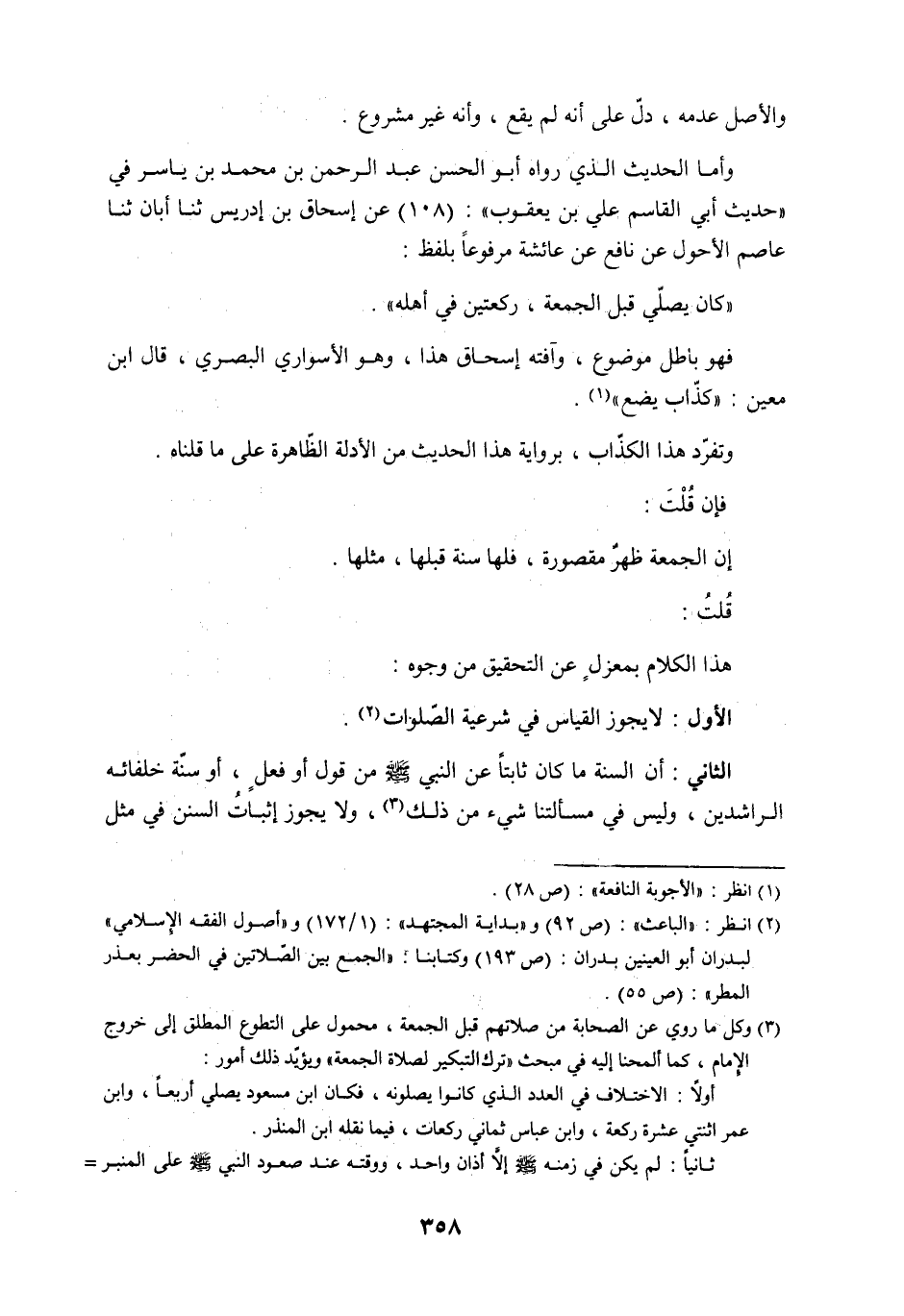 الثاني: أن السنة ما كان ثابتاً عن النبي - صلى الله عليه وسلم - من قول أو فعلٍ، أو سنّة خلفائه الراشدين، وليس في مسألتنا شيء من ذلك (4) ، ولا يجوز إثباتُ السنن في مثل