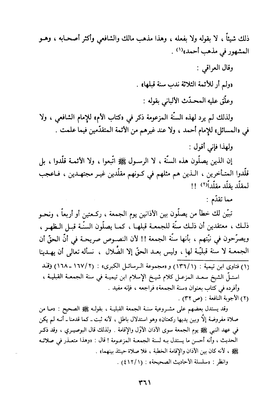 ولهذا فإني أقول: إن الذين يصلّون هذه السنّة، لا - صلى الله عليه وسلم - الرسول اتّبعوا، ولا الأئمة قلّدوا، بل قلدوا المتأخرين، الذين هم مثلهم في كونهم مقلّدين غير مجتهدين، فاعجب لمقلّد يقلّد مقلّداً (5) .