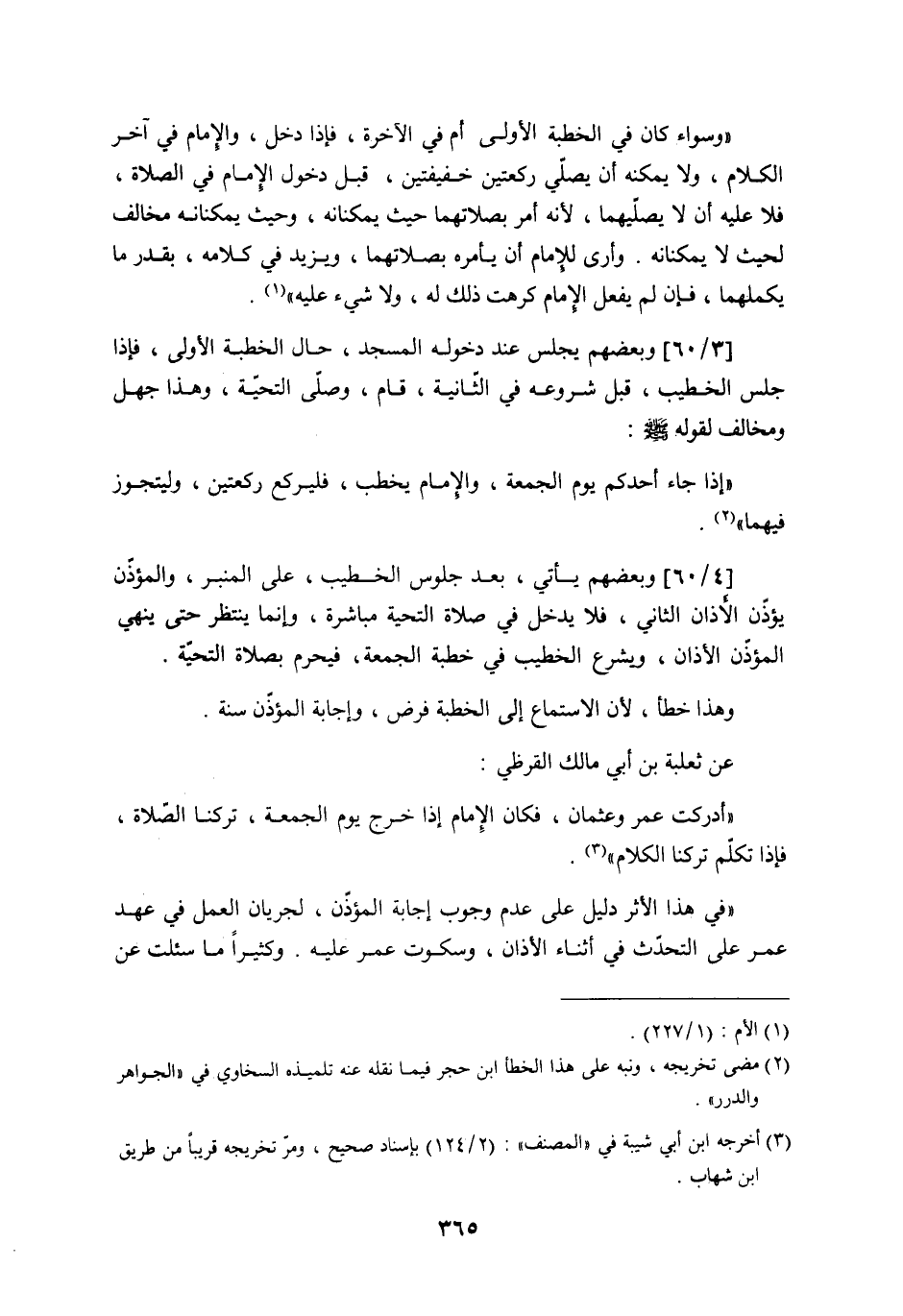 [4/60] وبعضهم يأتي، بعد جلوس الخطيب، على المنبر، والمؤذّن يؤذّن الأَذان الثاني، فلا يدخل في صلاة التحية مباشرة، وإنما ينتظر حتى ينهي المؤذّن الأذان، ويشرع الخطيب في خطبة الجمعة، فيحرم بصلاة التحيّة. وهذا خطأ، لأن الاستماع إلى الخطبة فرض، وإجابة المؤذّن سنة.