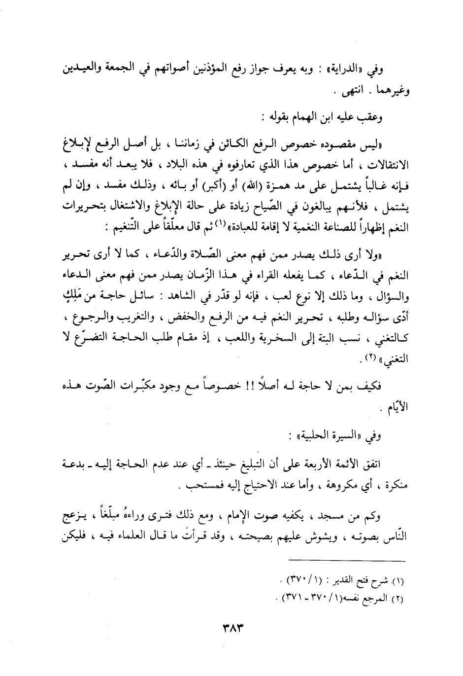 وعقب عليه ابن الهمام بقوله: ((ليس مقصوده خصوص الرفع الكائن في زماننا، بل أصل الرفع لإِبلاغ الانتقالات، أما خصوص هذا الذي تعارفوه في هذه البلاد، فلا يبعد أنه مفسد، فإنه غالباً يشتمل على مد الهمزة (الله) أو (أكبر) أو بائه، وذلك مفسد، وإن لم يشتمل، فلأنهم يبالغون في الصّياح زيادة على حالة الإِبلاغ والاشتغال بتحريرات النغم إظهاراً للصناعة النغمية لا إقامة للعبادة)) (3) ثم قال معلقاً على التّنغيم: ((ولا