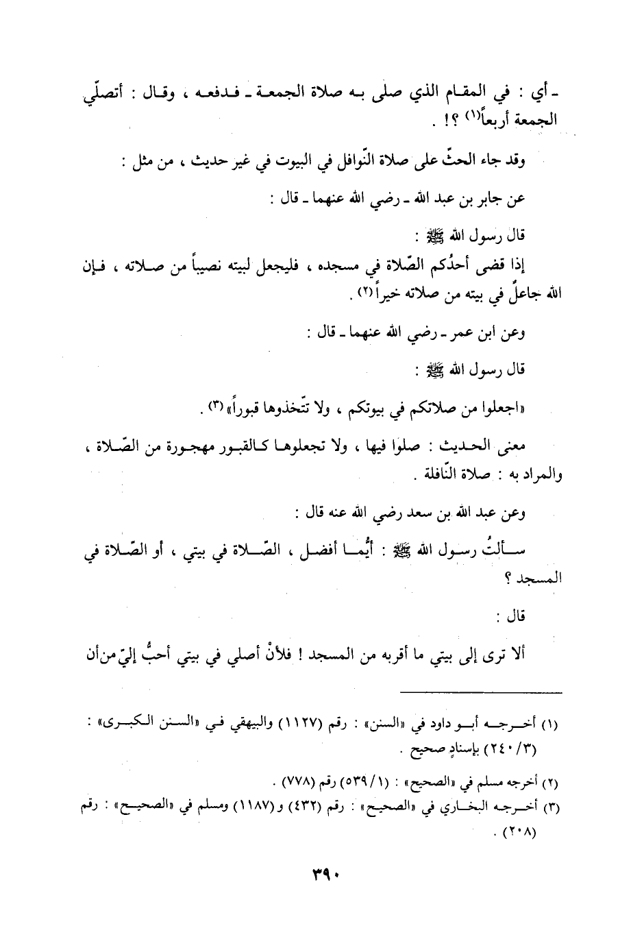 عن جابر بن عبد الله ـ رضي الله عنهما ـ قال رسول الله - صلى الله عليه وسلم -: إذا قضى أحدُكم الصّلاة في مسجده، فليجعل لبيته نصيباً من صلاته، فإن الله جاعلُ في بيته من صلاته خيراً (4) .