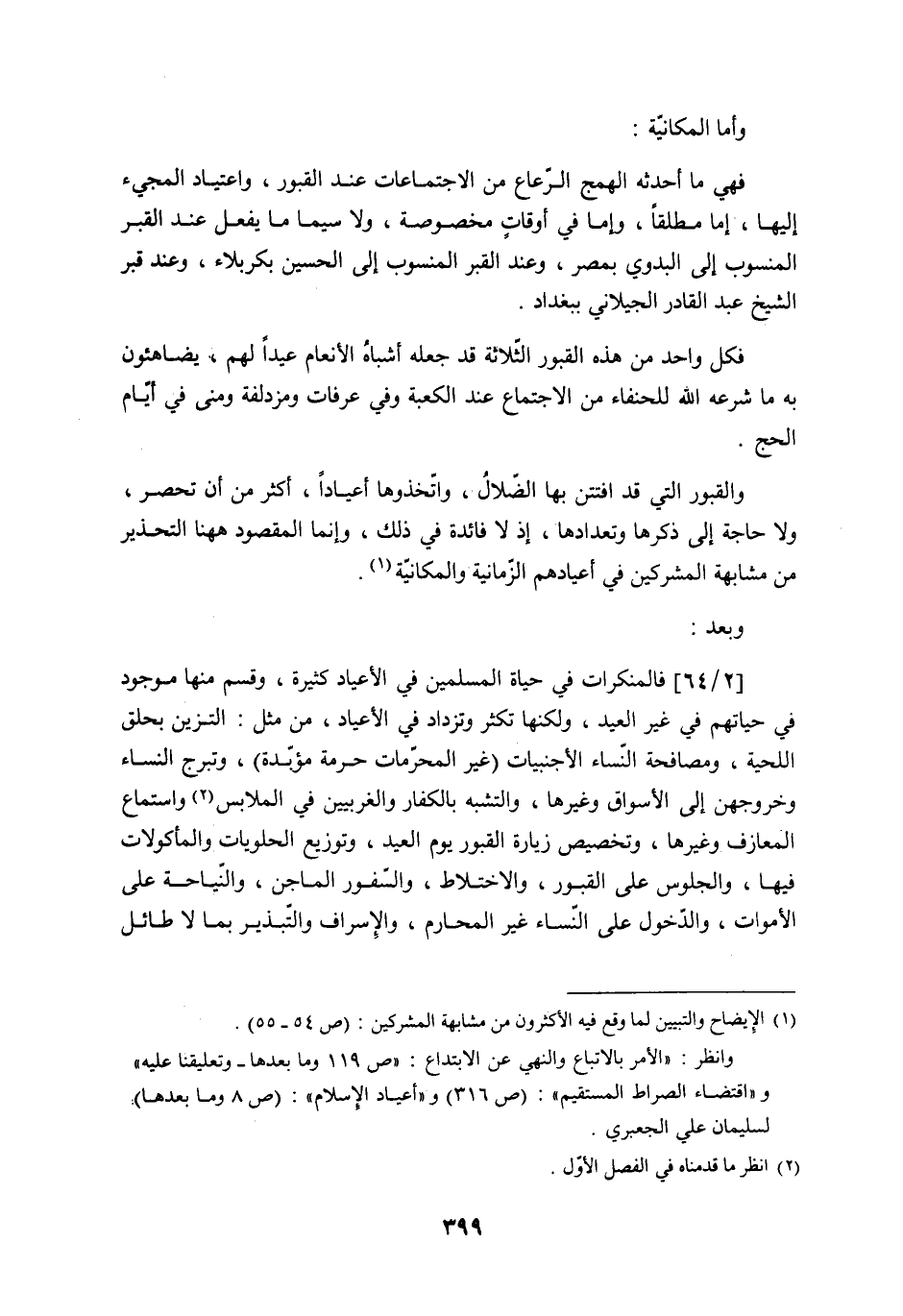 فكل واحد من هذه القبور الثّلاثة قد جعله أشباهُ الأنعام عيداً لهم، يضاهئون به ما شرعه الله للحنفاء من الاجتماع عند الكعبة وفي عرفات ومزدلفة ومنى في أيّام الحج. والقبور التي قد افتتن بها الضّلالُ، واتّخذوها أعياداً، أكثر من أن تحصر، ولا حاجة إلى ذكرها وتعدادها، إذ لا