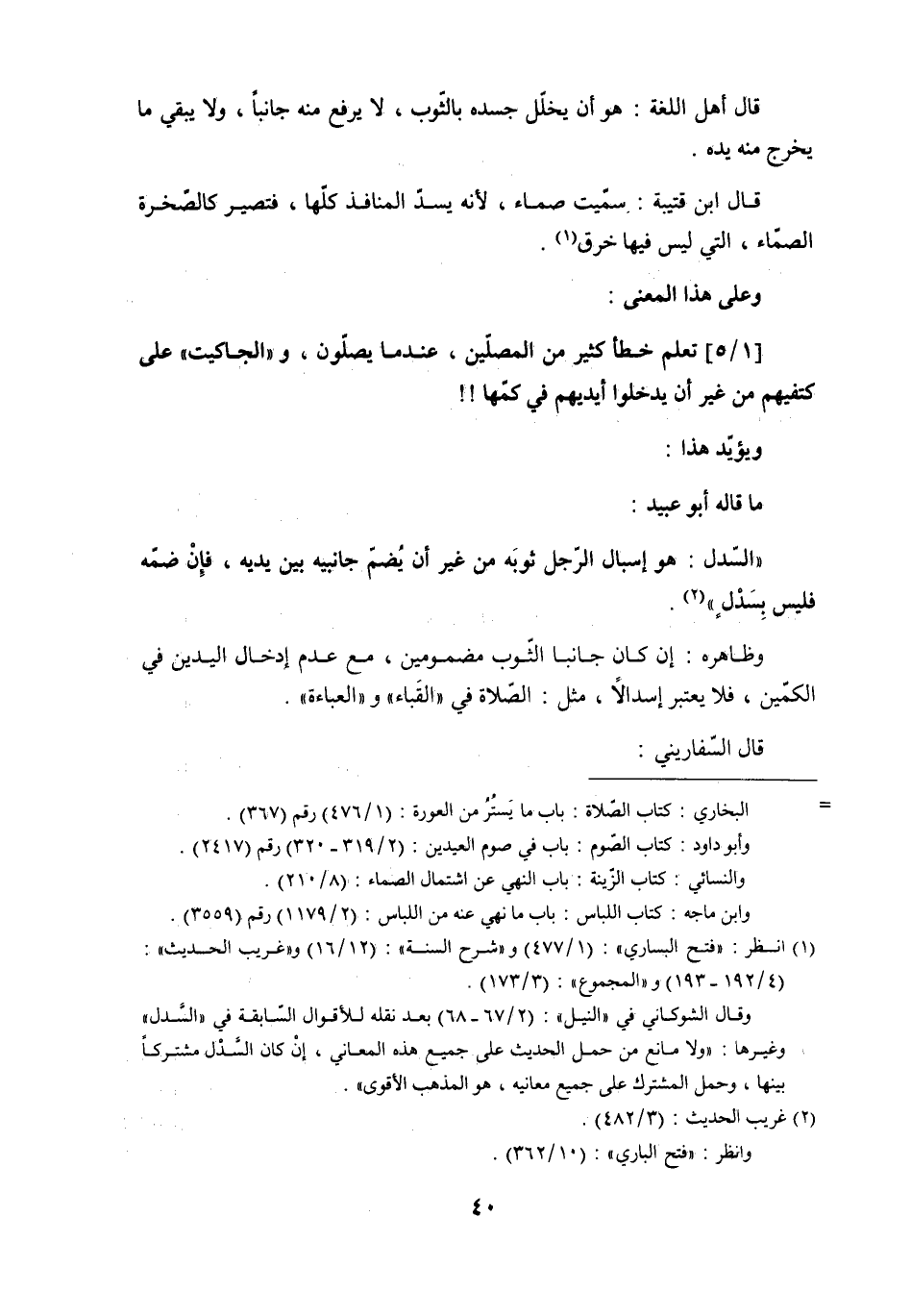 = (3/173) . وقال الشوكاني في ((النيل)) : (2/67-68) بعد نقله للأقوال السّابقة في ((السَّدل)) وغيرها: ((ولا مانع من حمل الحديث على جميع هذه المعاني، إن كان السَّدْل مشتركاً بينها، وحمل المشترك على جميع معانيه، هو المذهب الأقوى)) .