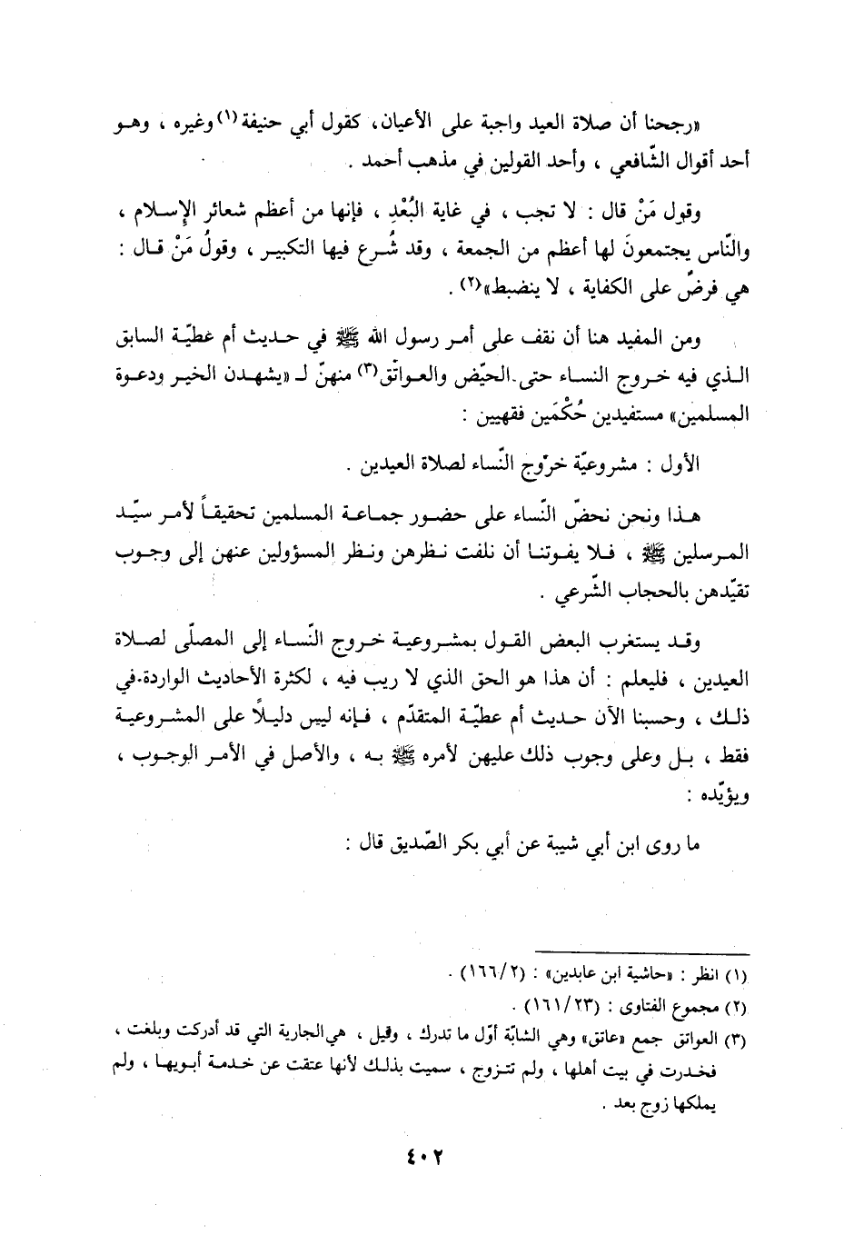 ((رجحنا أن صلاة العيد واجبة على الأعيان، كقول أبي حنيفة (5) وغيره، وهو أحد أقوال الشّافعي، وأحد القولين في مذهب أحمد.