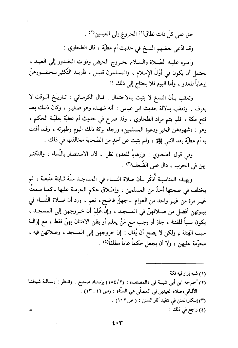 وقد ادّعى بعضهم النسخ في حديث أم عطيّة، قال الطحاوي: وأمره عليه الصّلاة والسلام بخروج الحيض وذوات الخدور إلى العيد، يحتمل أن يكون في أوّل الإسلام، والمسلمون قليل، فأريد التّكثير بحضورهنّ إرهاباً للعدو، وأما اليوم فلا يحتاج إلى ذلك!!