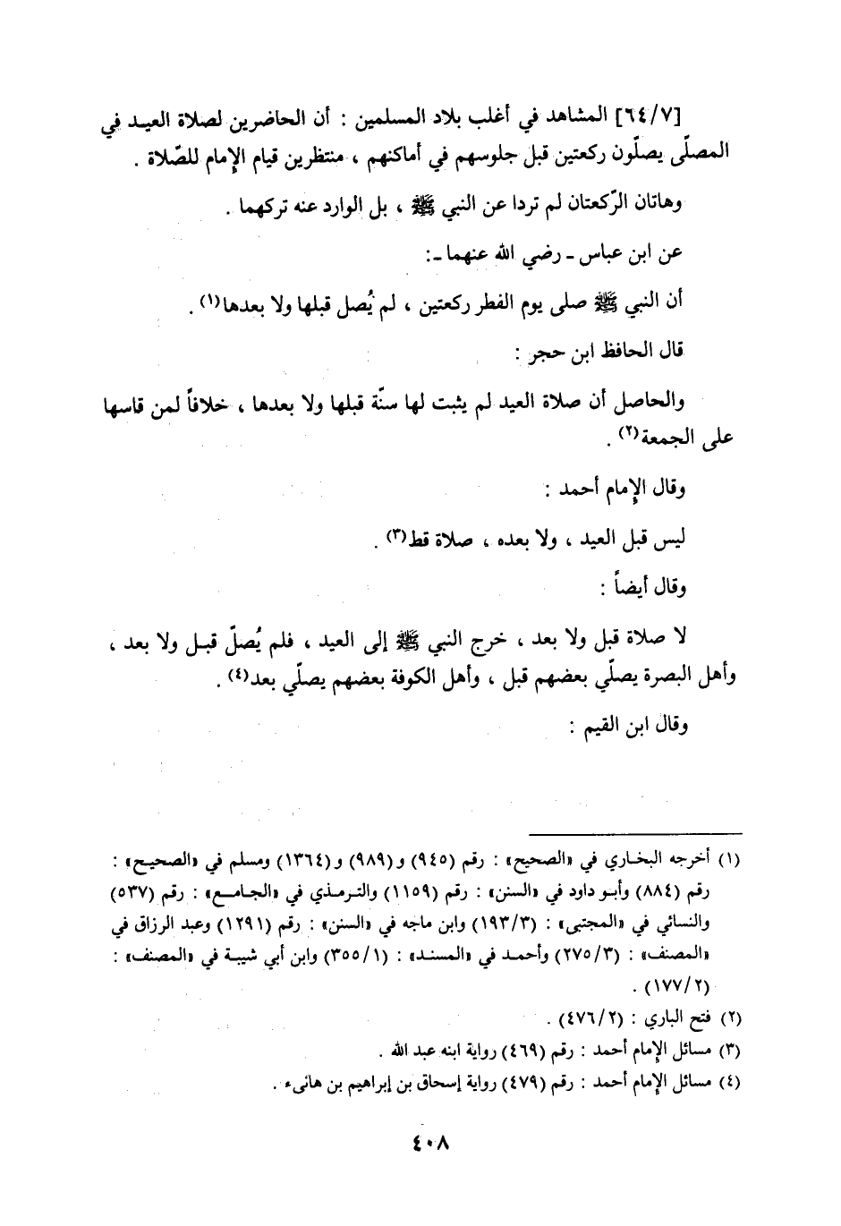 [7/64] المشاهد في أغلب بلاد المسلمين: أن الحاضرين لصلاة العيد في المصلّى يصلّون ركعتين قبل جلوسهم في أماكنهم، منتظرين قيام الإمام للصّلاة. وهاتان الرّكعتان لم تردا عن النبي صلى الله عليه وسلم، بل الوارد عنه تركهما.