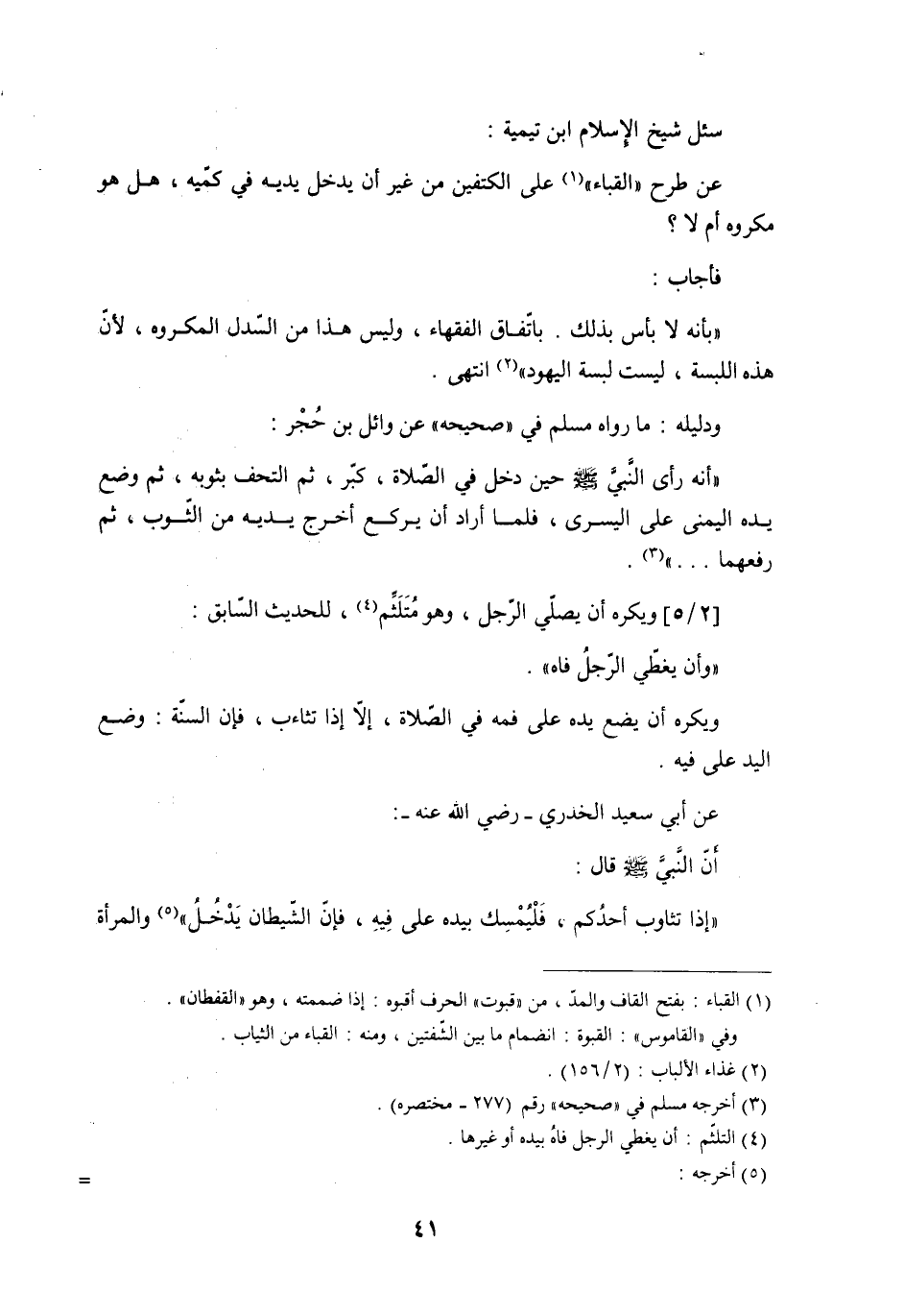 سئل شيخ الإسلام ابن تيمية: عن طرح ((البقاء)) (¬1) على الكتفين من غير أن يدخل يديه في كمّيه، هل هو مكروه أم لا؟ فأجاب: ((بأنه لا بأس بذلك باتّفاق الفقهاء، وليس هذا من السّدل المكروه، لأن هذه اللبسة، ليست لبسة اليهود)) (¬2) انتهى.