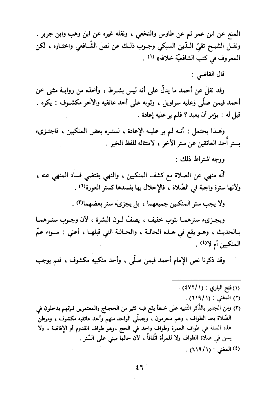 وهذا يحتمل: أنه لم ير عليه الإعادة، لستره بعض المنكبين، فاجتزىء بستر أحد العاتقين عن ستر الآخر، لامتثاله للفظ الخبر. ووجه اشتراط ذلك: أنه منهي عن الصلاة مع كشف المنكبين، والنهي يقتضي فساد المنهي عنه، ولأنها سترة واجبة في الصّلاة، فالإخلال بها يفسدها كستر العورة (¬2) .