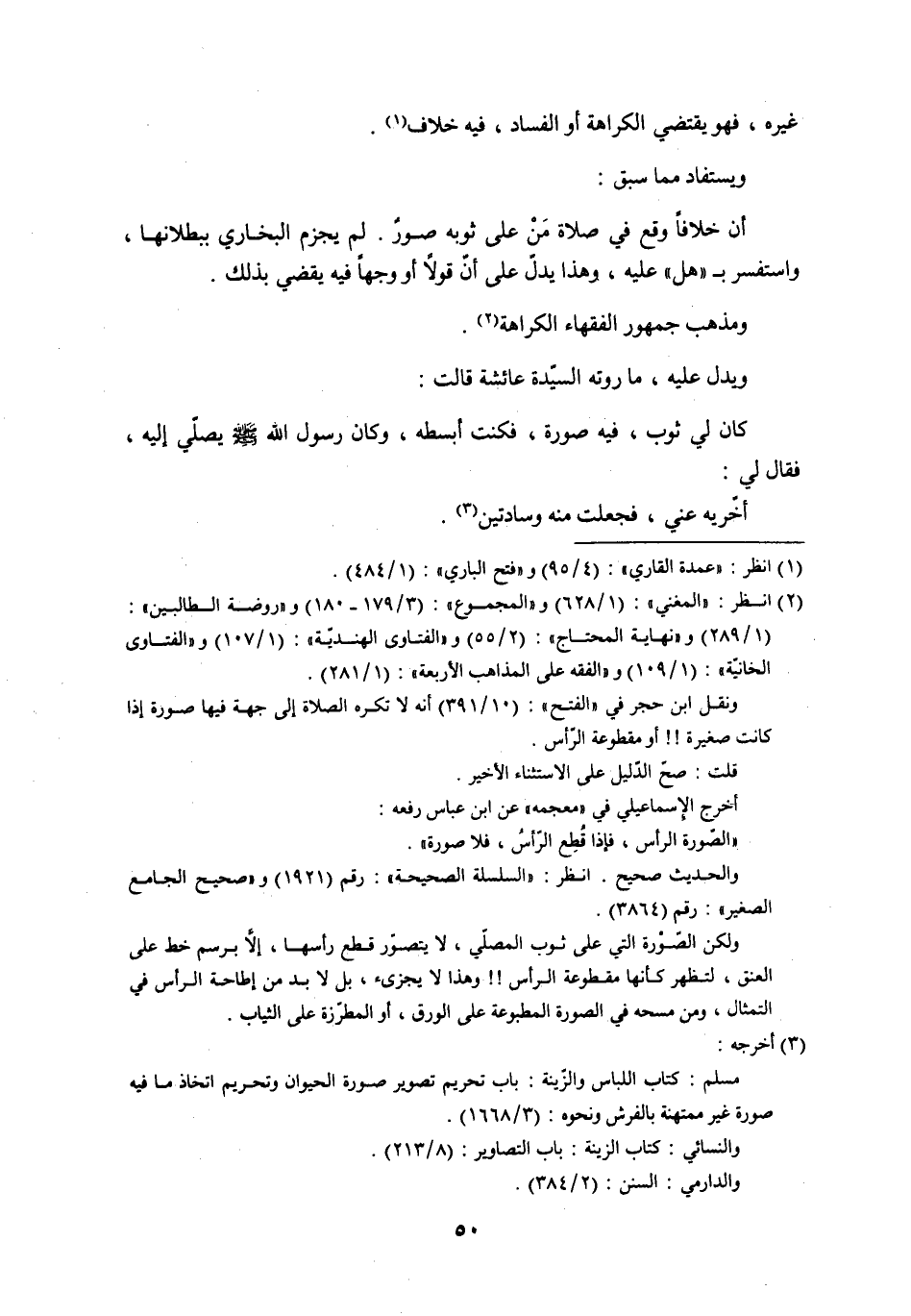 ولكن الصّوْرة التي على ثوب المصلّي، لا يتصوّر قطع رأسها، إلاَّ برسم خط على العنق، لتظهر كأنها مقطوعة الرأس!! وهذا لا يجزىء، بل لابد من إطاحة الرأس في التمثال، ومن مسحه في الصورة المطبوعة على الورق، أو المطرّزة على الثياب.