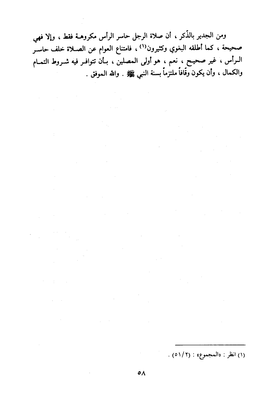 ومن الجدير بالذّكر، أن صلاة الرجل حاسر الرأس مكروهة فقط، وإلا فهي صحيحة، كما أطلقه البغوي وكثيرون (¬1) ، فامتناع العوام عن الصلاة خلف حاسر الرأس، غير صحيح، نعم، هو أولى المصلين، بأن تتوافر فيه شروط التمام والكمال، وأن يكون وقّافاً ملتزماً بسنة النبي - صلى الله عليه وسلم -.
