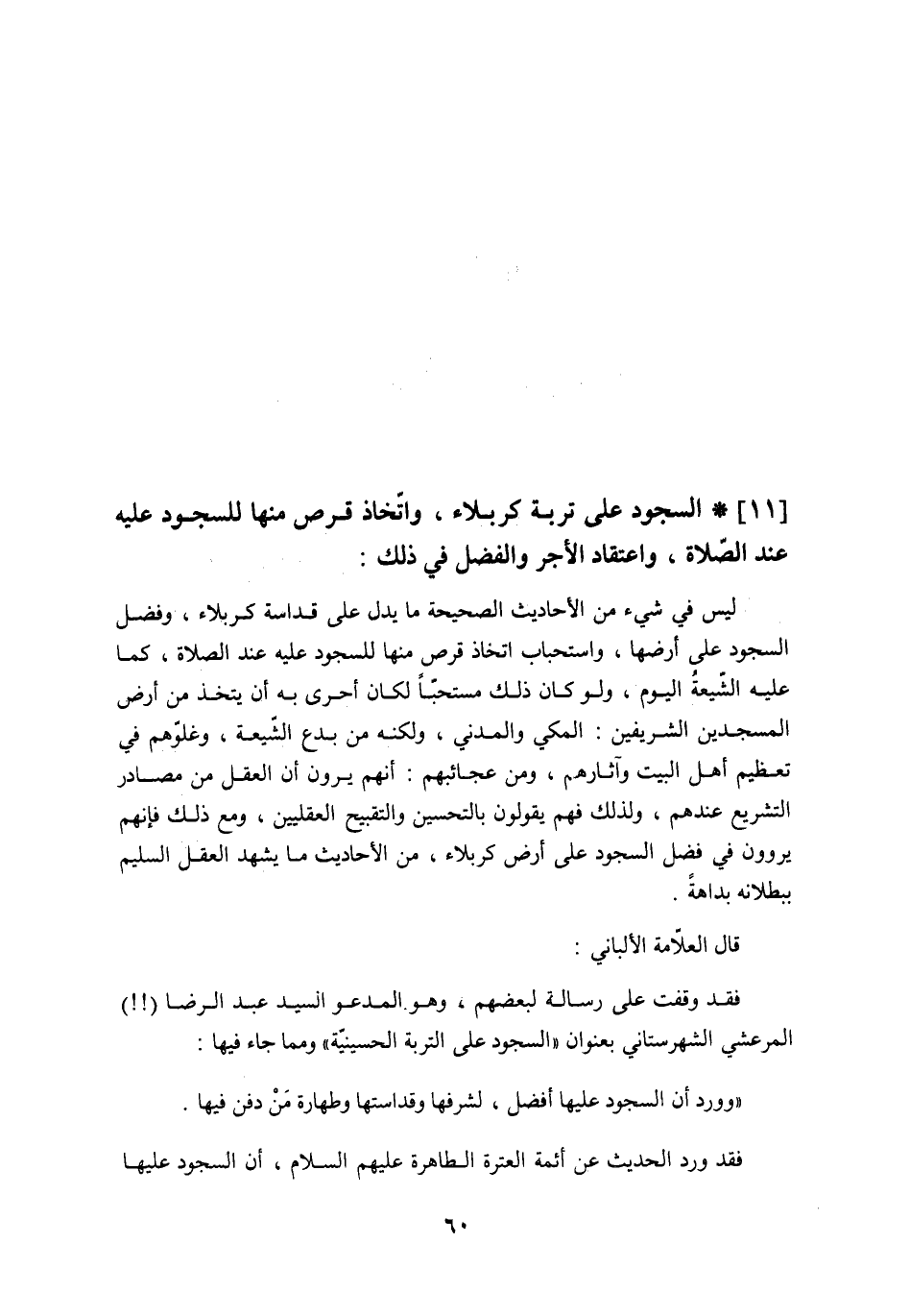 قال العلّامة الألباني: فقد وقفت على رسالة لبعضهم، وهو المدعو السيد عبد الرضا (!!) المرعشي الشهرستاني بعنوان ((السجود على التربة الحسينيّة)) ومما جاء فيها: ((وورد أن السجود عليها أفضل، لشرفها وقداستها وطهارة مَنْ دفن فيها. فقد ورد الحديث عن أئمة العترة الطاهرة عليهم السلام، أن السجود عليها