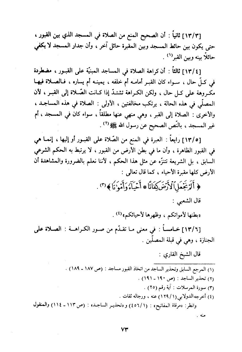 [5/13] رابعاً: العبرة في المنع من الصّلاة على القبور أو إليها، إنما هي في القبور الظاهرة، وأن ما في بطن الأرض من القبور، لا يرتبط به الحكم الشرعي السابق، بل الشريعة تتنزّه عن مثل هذا الحكم، لأننا نعلم بالضرورة والمشاهدة أن الأرض كلها مقبرة الأحياء، كما قال تعالى: {أَلَمْ نَجْعَلِ الْأَرْضَ كِفَاتًا * أَحْيَاء وَأَمْوَاتًا} (¬3) .
