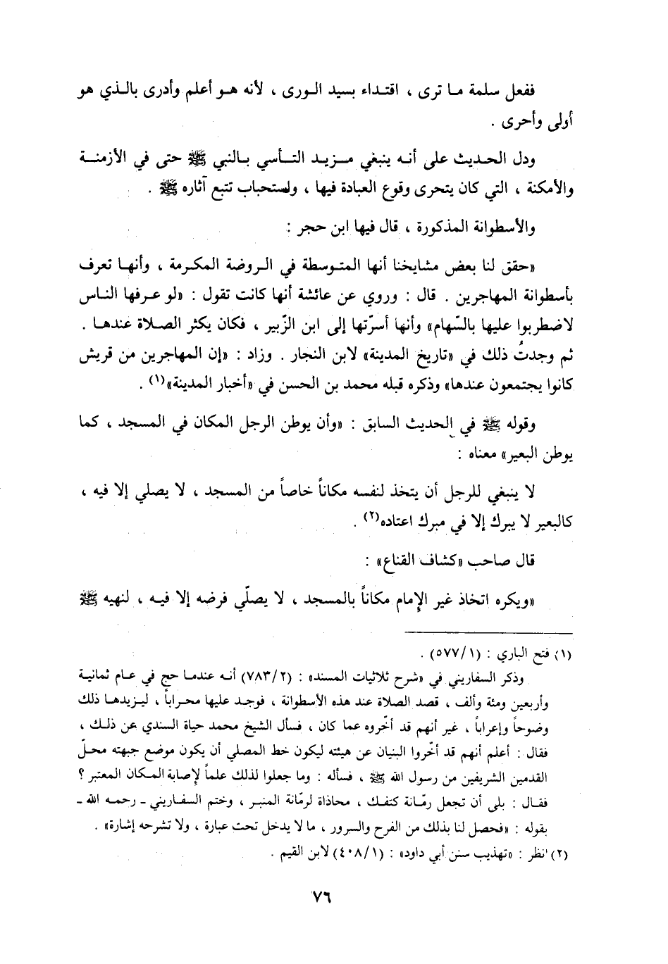 أن يكون موضع جبهته محلَ القدمين الشريفين من رسول الله - صلى الله عليه وسلم -، فسأله: وما جعلوا لذلك علماً لإصابة المكان المعتبر؟ فقال: بلى أن تجعل رمّانة كتفك، محاذاة لرمّانة المنبر، وختم السفاريني- رحمه الله –بقوله: ((فحصل لنا بذلك من الفرح والسرور، ما لا يدخل تحت عبارة، ولا تشرحه إشارة)) .