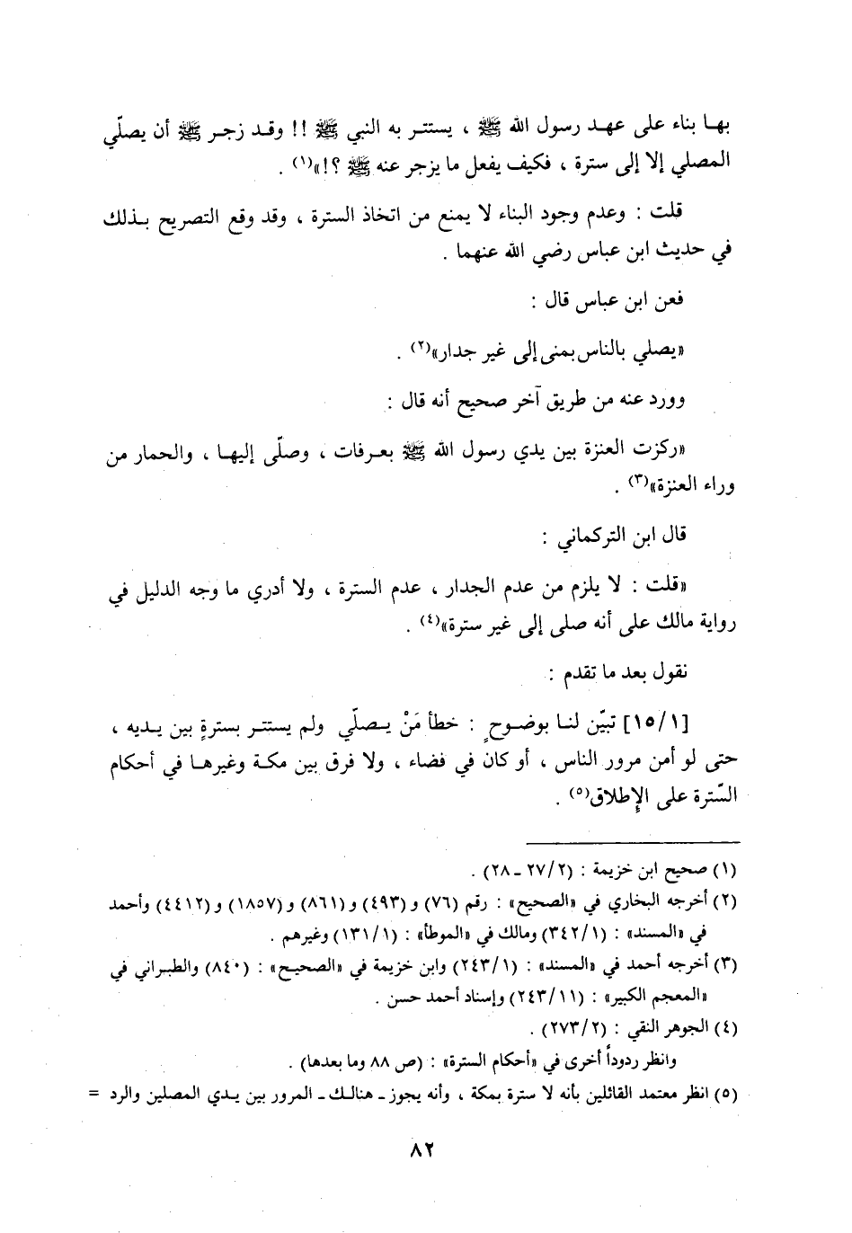 (¬5) 5 (انظر معتمد القائلين بأنه لا سترة بمكة، وأنه يجوز - هنالك- المرور بين يدي المصلين والرد عليه في ((سلسلة الأحاديث الضعيفة والموضوعة)) : رقم (928) وكتاب ((أحكام السترة في مكة وغيرها)) : (ص 46-48) و (ص 120-126) ، وتقييد المرور بالضرورة أمر لا مندوجة عنه، وخصوصاً في حالة الازدحام الشديد، وقد قال به الحافظ ابن حجر في ((الفتح)) : (1/576) والزرقاني في ((شرحه على مختصر خليل)) : (1/209) ، والله اعلم.