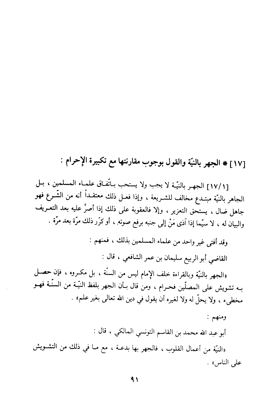 [1/17] الجهر بالنيّة لا يجب ولا يستحب باتّفاق علماء المسلمين، بل الجاهر بالنيّة مبتدع مخالف للشريعة، وإذا فعل ذلك معتقداً أنه من الشّرع فهو جاهل ضال يستحق التعزير، وإلا فالعقوبة على ذلك إذا أصرَّ عليه بعد التعريف والبيان له، لاسيّما إذا آذى مَنْ إلى جنبه برفع صوته، أو كرّر ذلك مرّة بعد مرّة.