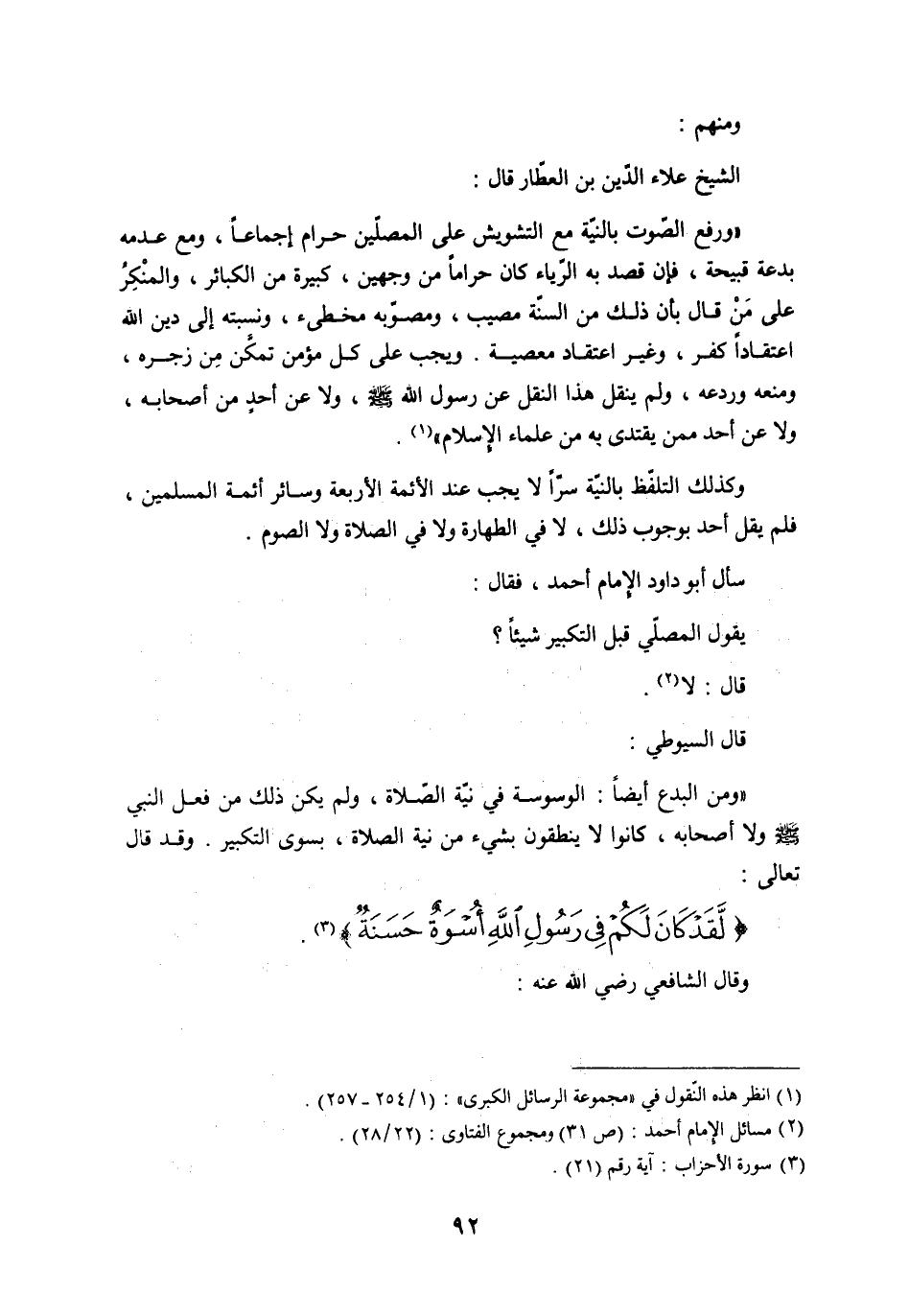 ومنهم: الشيخ علاء الدّين بن العطّار قال: ورفع الصّوت بالنيّة مع التشويش على المصلّين حرام إجماعاً، ومع عدمه بدعة قبيحة، فإن قصد به الرّياء كان حراماً من وجهين، كبيرة من الكبائر، والمنْكِرُ على مَنْ قال بأن ذلك من السنّة مصيب، ومصوّبة مخطئ، ونسبته إلي دين الله اعتقاداً كفر، وغير اعتقاد معصية.