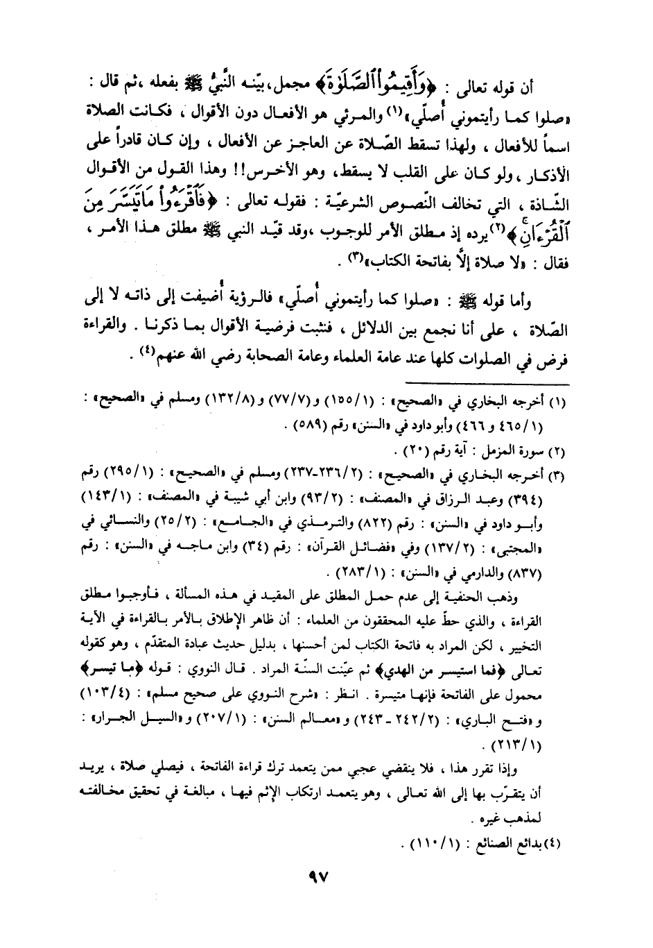 وأما قوله - صلى الله عليه وسلم -: ((صلوا كما رأيتموني أُصلّي)) فالرؤية أُضيفت إلى ذاته لا إلى الصّلاة، على أنا نجمع بين الدلائل، فتثبت فرضية الأقوال بما ذكرنا. والقراءة فرض في الصلوات كلها عند عامة العلماء وعامة الصحابة رضي الله عنهم (¬4) .