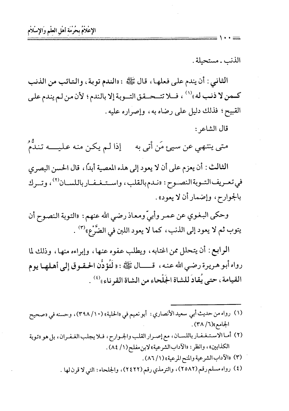الرابع: أن يتحلل ممن اغتابه، ويطلب عفوه عنها، وإبراءه منها، وذلك لما رواه أبو هريرة رضي الله عنه، قال - صلى الله عليه وسلم -: " لَتُؤدُّن الحقوق إِلى أهلها يوم القيامة , حتى يُقادَ للشاة الجَلْحاء من الشاة القرناء " (¬4).