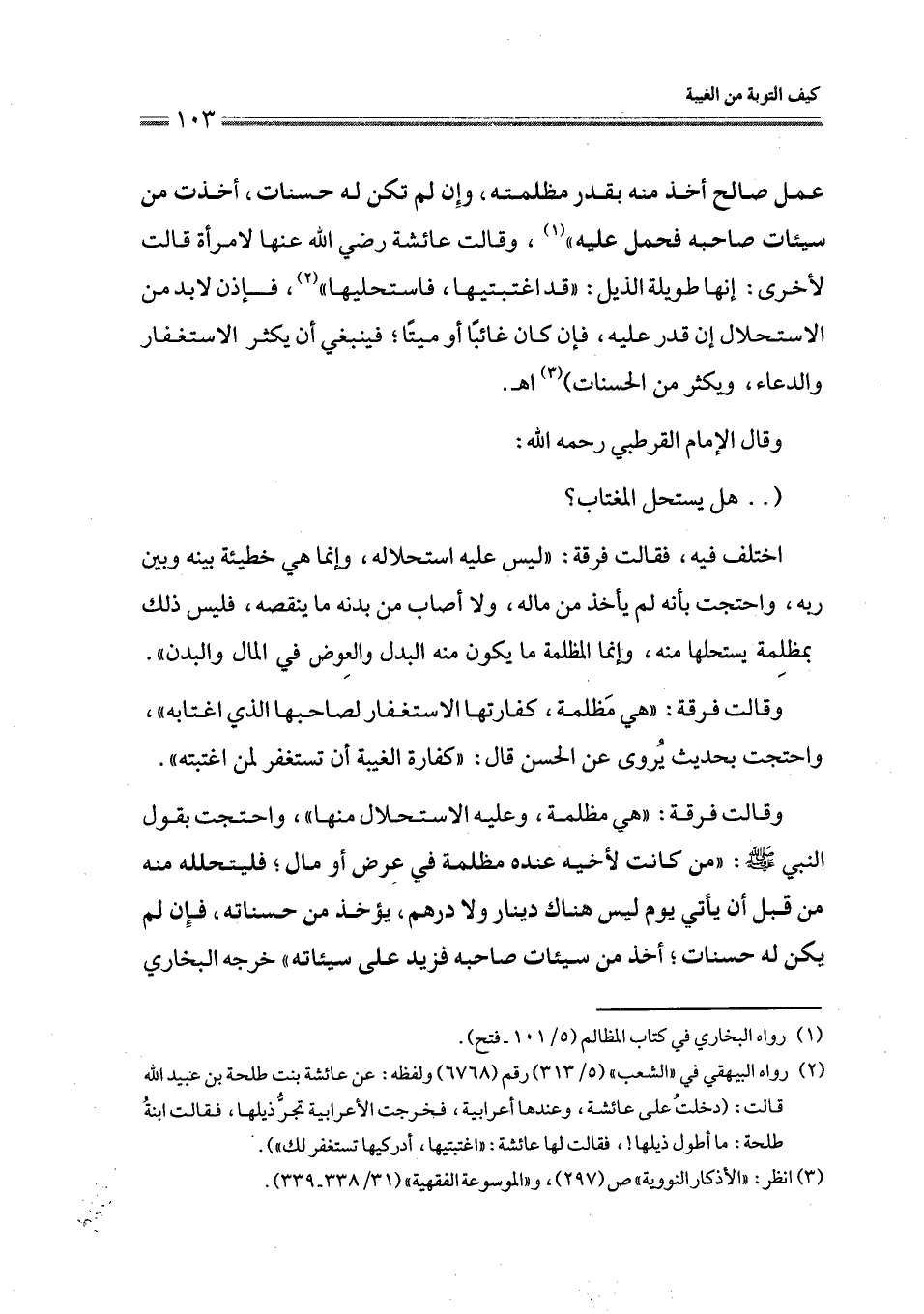 عمل صالح أخذ منه بقدر مظلمته، وإِن لم تكن له حسنات، أخذت من سيئات صاحبه فحمل عليه " (¬1)، وقالت عائشة رضي الله عنها لامرأة قالت لأخرى: إنها طويلة الذيل: " قد اغتبتيها، فاستحليها " (¬2)، فإذن لابد من الاستحلال إن قدر عليه، فإن كان غائبًا أو ميتًا؛ فينبغي أن يكثر الاستغفار والدعاء، ويكثر من الحسنات) (¬3) اهـ.