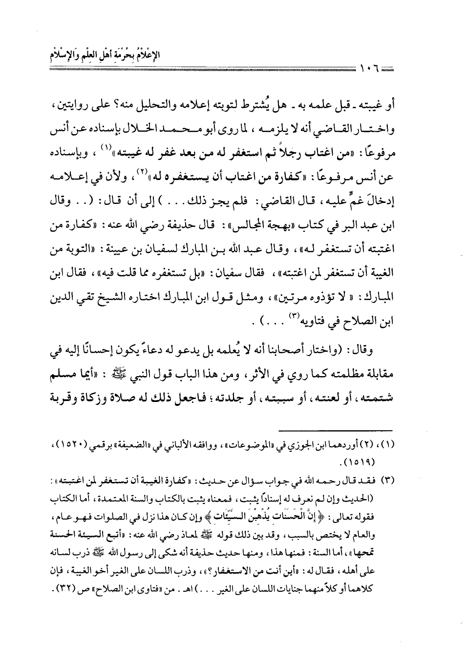 او غيبته -قبل علمه به- هل يُشترط لتوبته إعلامه والتحليل منه؟ على روايتين، واختار القاضي أنه لا يلزمه، لما روى أبو محمد الخلال بإسناده عن أنس مرفوعًا: " من اغتاب رجلاً ثم استغفر له من بعد غفر له غيبته " (¬1)، وبإسناده عن أنس مرفوعًا: " كفارة من اغتاب أن يستغفره له " (¬2)، ولأن في إعلامه إدخالَ غمًّ علمه، قال القاضي: فلم يجز ذلك ... ) إلى أن قال: ( .. وقال ابن عبد البر في كتاب " بهجة المجالس ": قال حذيفة رضي الله عنه: " كفارة من اغتبته أن تستغفر له "، وقال عبد الله بن المبارك لسفيان بن عيينة: " التوبة من الغيبة أن تستغفر لمن اغتبته "، فقال سفيان: " بل تستغفره مما قلت فيه "، فقال ابن المبارك: " لا تؤذوه مرتين "، ومثل قول ابن المبارك اختاره الشيخ تقي الدين ابن الصلاح في فتاويه (¬3) ... ).