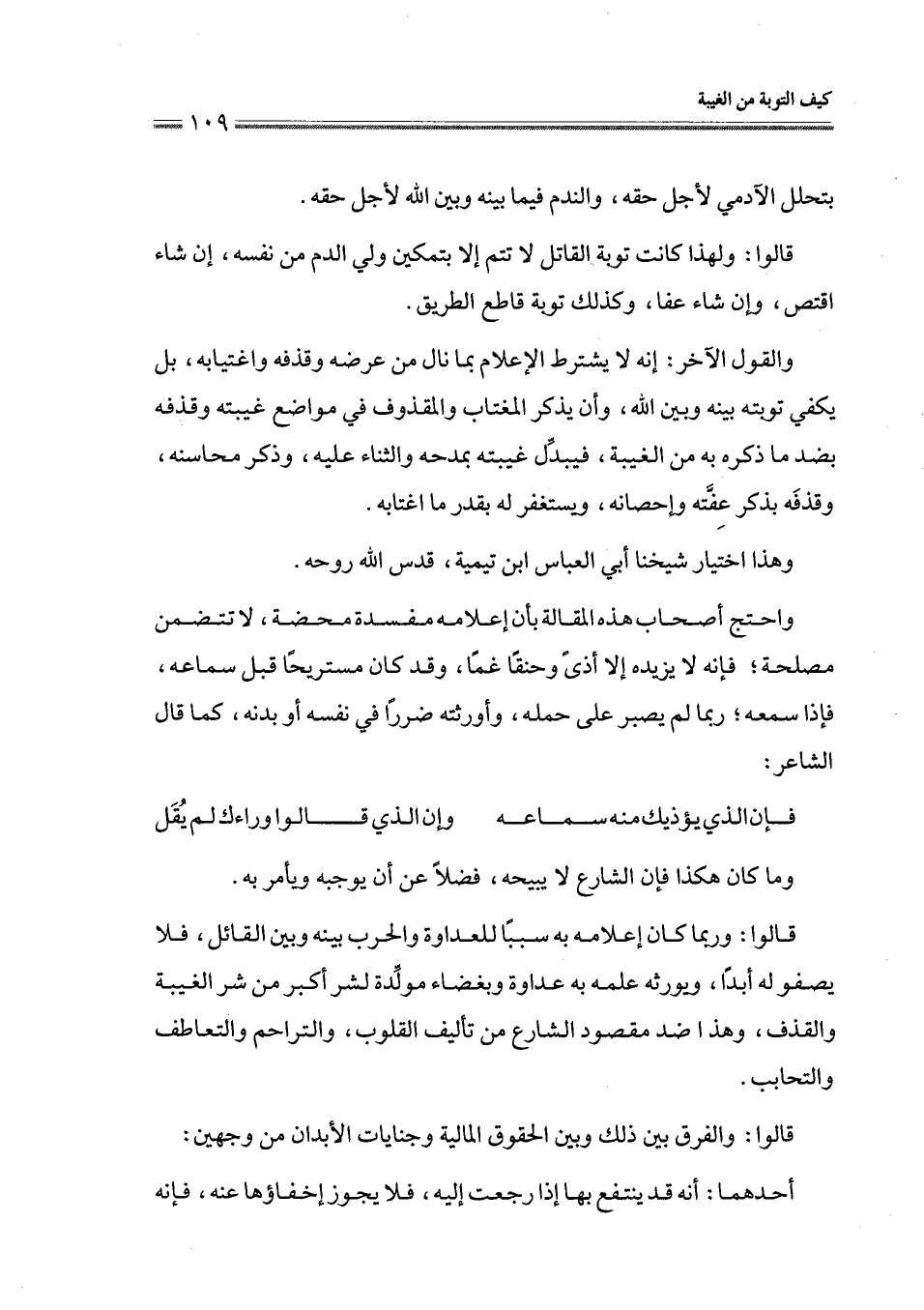 والقول الآخر: إنه لا يشترط الإعلام بما نال من عرضه وقذفه واغتيابه، بل يكفي توبته بينه وبين الله، وأن يذكر المغتاب والمقذوف في مواضع غيبته وقذفه بضد ما ذكره به من الغيبة، فيبدِّل غيبته بمدحه والثناء عليه، وذكر محاسنه، وقذفَه بذكر عِفَّته وإحصانه، ويستغفر له بقدر ما اغتابه.