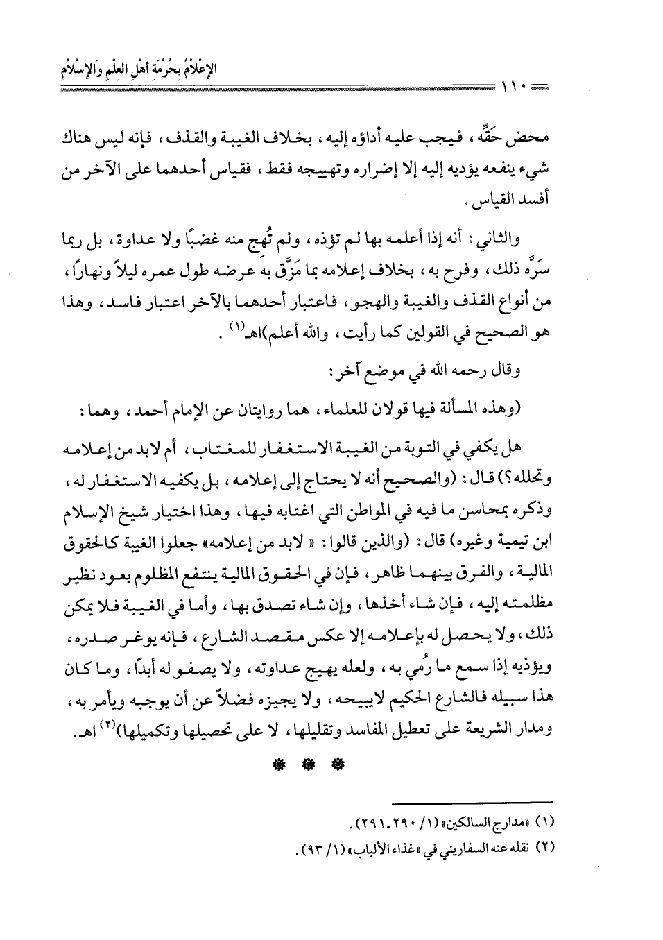 هل يكفي في التوبة من الغيبة الاستغفار للمغتاب، أم لا بد من إعلامه وتحلله؟) قال: (والصحيح أنه لا يحتاج إلى إعلامه، بل يكفيه الاستغفار له، وذكره بمحاسن ما فيه في المواطن التي اغتابه فيها، وهذا اختيار شيخ الإسلام ابن تيمية وغيره) قال. (والذين قالوا: " لا بد من إعلامه " جعلوا الغيبة كالحقوق المالية، والفرق بينهما ظاهر، فإن في الحقوق المالية ينتفع المظلوم بعود نظير مظلمته إليه، فإن شاء أخذها، وإن شاء تصدق بها، وأما في الغيبة فلا يمكن ذلك، ولا يحصل له بإعلامه إلا عكس مقصد الشارع، فإنه يوغر صدره، ويؤذيه إذا سمع ما رُمي به، ولعله يهيج عداوته، ولا يصفو له أبدًا، وما كان هذا سبيله فالشارع الحكيم لا يبيحه، ولا يجيزه فضلاً عن أن يوجبه ويأمر به، ومدار الشريعة على تعطيل المفاسد وتقليلها، لا على تحصيلها وتكميلها) (¬2) اهـ.