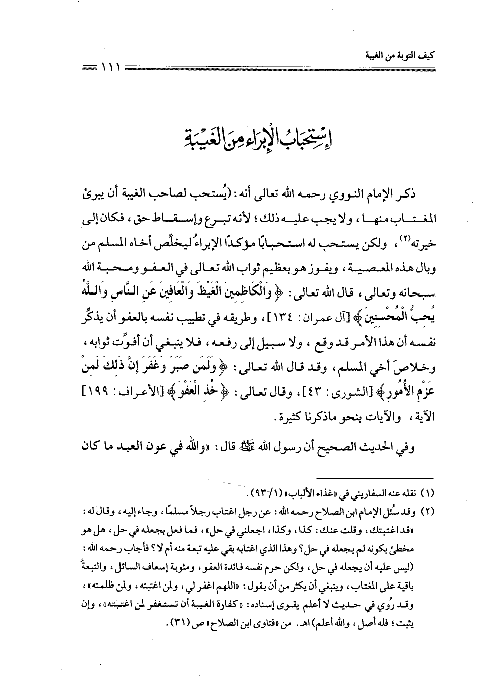 ذكر الإمام النووي رحمه الله تعالى أنه: (يُستحب لصاحب الغيبة أن يبرئ المغتاب منها، ولا يجب عليه ذلك؛ لأنه تبرع وإسقاط حق، فكان إلى خيرته (¬1)، ولكن يستحب له استحبابًا مؤكدًا الإبراءُ ليخلِّص أخاه المسلم من وبال هذه المعصية، ويفوز هو بعظيم ثواب الله تعالى في العفو ومحبة الله سبحانه وتعالى، قال الله تعالى: {وَالْكَاظِمِينَ الْغَيْظَ وَالْعَافِينَ عَنِ النَّاسِ وَاللَّهُ يُحِبُّ الْمُحْسِنِينَ} [آل عمران: 134]، وطريقه في تطييب نفسه بالعفو أن يذكِّر نفسه أن هذا الأمر قد وقع، ولا سبيل إلى رفعه، فلا ينبغي أن أفوّت ثوابه، وخلاصَ أخي المسلم، وقد قال الله تعالى: {وَلَمَنْ صَبَرَ وَغَفَرَ إِنَّ ذَلِكَ لَمِنْ عَزْمِ الْأُمُورِ} [الشورى: 43]، وقال تعالى: {خُذِ الْعَفْوَ} [الأعراف: 199]، الآية، والآيات بنحو ما ذكرنا كثيرة.