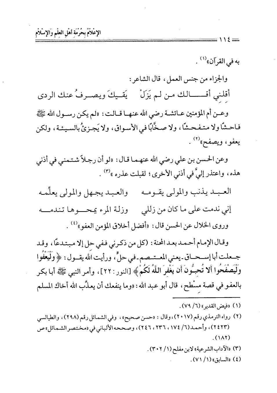 وقال الإمام أحمد بعد المحنة: (كل من ذكرني ففي حِل إلا مبتدعًا، وقد جعلت أبا إسحاق -يعني المعتصم- في حل، ورأيت الله يقول: {وَلْيَعْفُوا وَلْيَصْفَحُوا أَلَا تُحِبُّونَ أَنْ يَغْفِرَ اللَّهُ لَكُمْ} [النور: 22]، وأمر النبي - صلى الله عليه وسلم - أبا بكر بالعفو في قصة مِسْطح، قال أبو عبد الله: " وما ينفعك أن يعذِّب الله أخاك المسلم