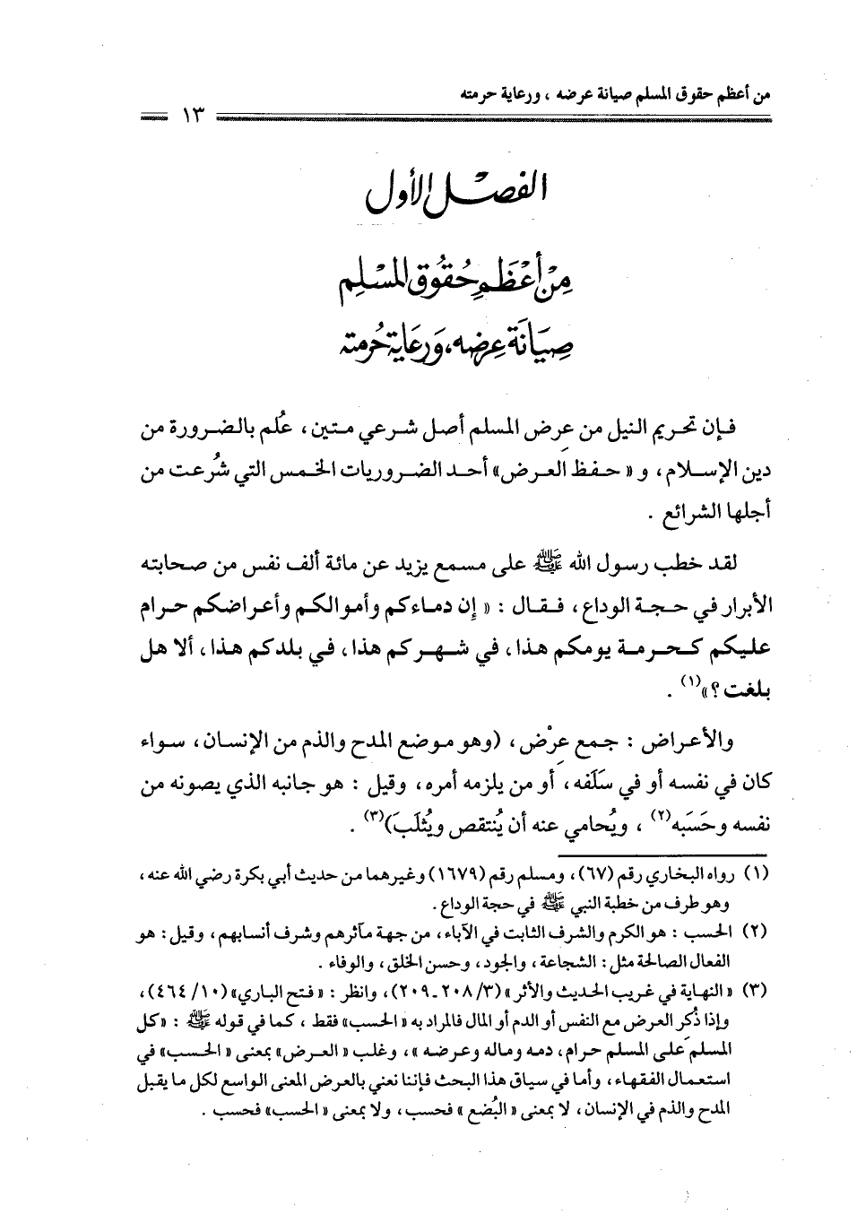 (¬3) " النهاية في غريب الحديث والأثر " (3/ 208 - 209)، وانظر: " فتح الباري " (10/ 464)، وإذا ذكر العرض مع النفس أو الدم أو المال فالمراد به " الحسب " فقط، كما في قوله - صلى الله عليه وسلم - " كل المسلم على المسلم حرام، دمه وماله وعرضه "، وغلب " العرض " بمعنى " الحسب " في استعمال الفقهاء، وأما في سياق هذا البحث فإننا نعني بالعرض المعنى الواسع لكل ما يقبل المدح والذم في الإنسان، لا بمعنى " البُضع " فحسب، ولا بمعنى " الحسب " فحسب.