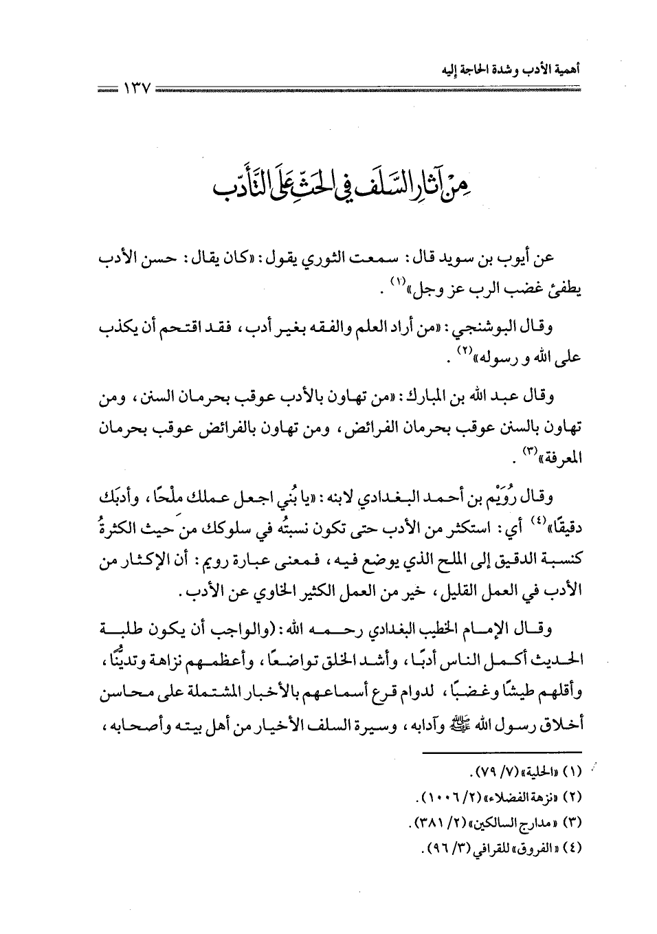 وقال رُوَيْم بن أحمد البغدادي لابنه: " يا بُني اجعل عملك مِلْحًا، وأدبَك دقيقًا " (¬4) أي: استكثر من الأدب حتى تكون نسبتُه في سلوكك من حيث الكثرةُ كنسبة الدقيق إلى الملح الذي يوضع فيه، فمعنى عبارة رويم: أن الإكثار من الأدب في العمل القليل، خير من العمل الكثير الخاوي عن الأدب.