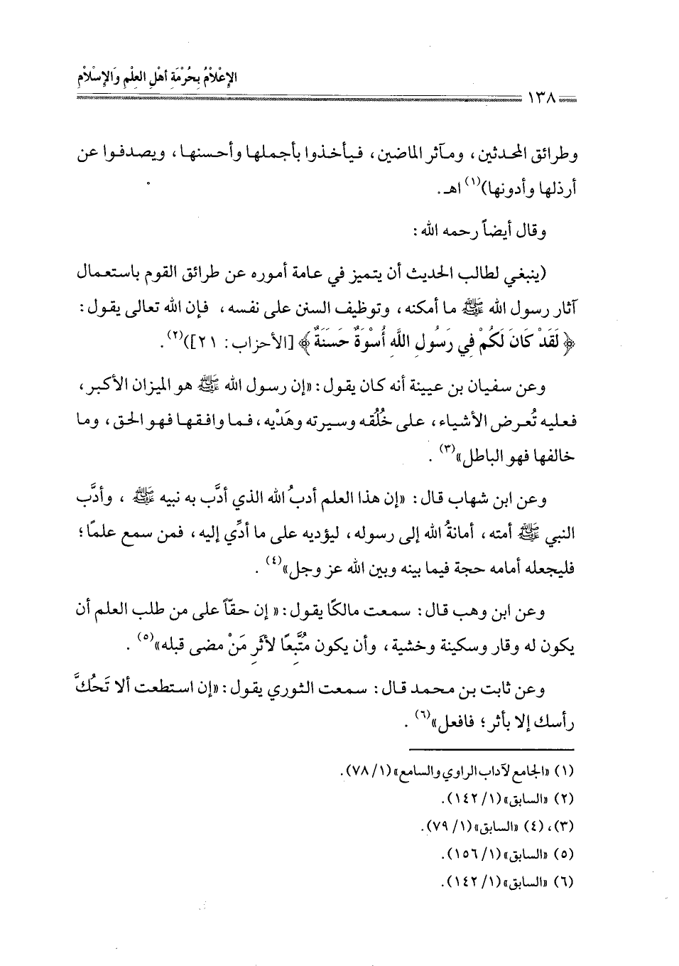 (ينبغي لطالب الحديث أن يتميز في عامة أموره عن طرائق القوم باستعمال آثار رسول الله - صلى الله عليه وسلم - ما أمكنه، وتوظيف السنن على نفسه، فإن الله تعالى يقول: {لَقَدْ كَانَ لَكُمْ فِي رَسُولِ اللَّهِ أُسْوَةٌ حَسَنَةٌ} [الأحزاب: 21] (¬2).