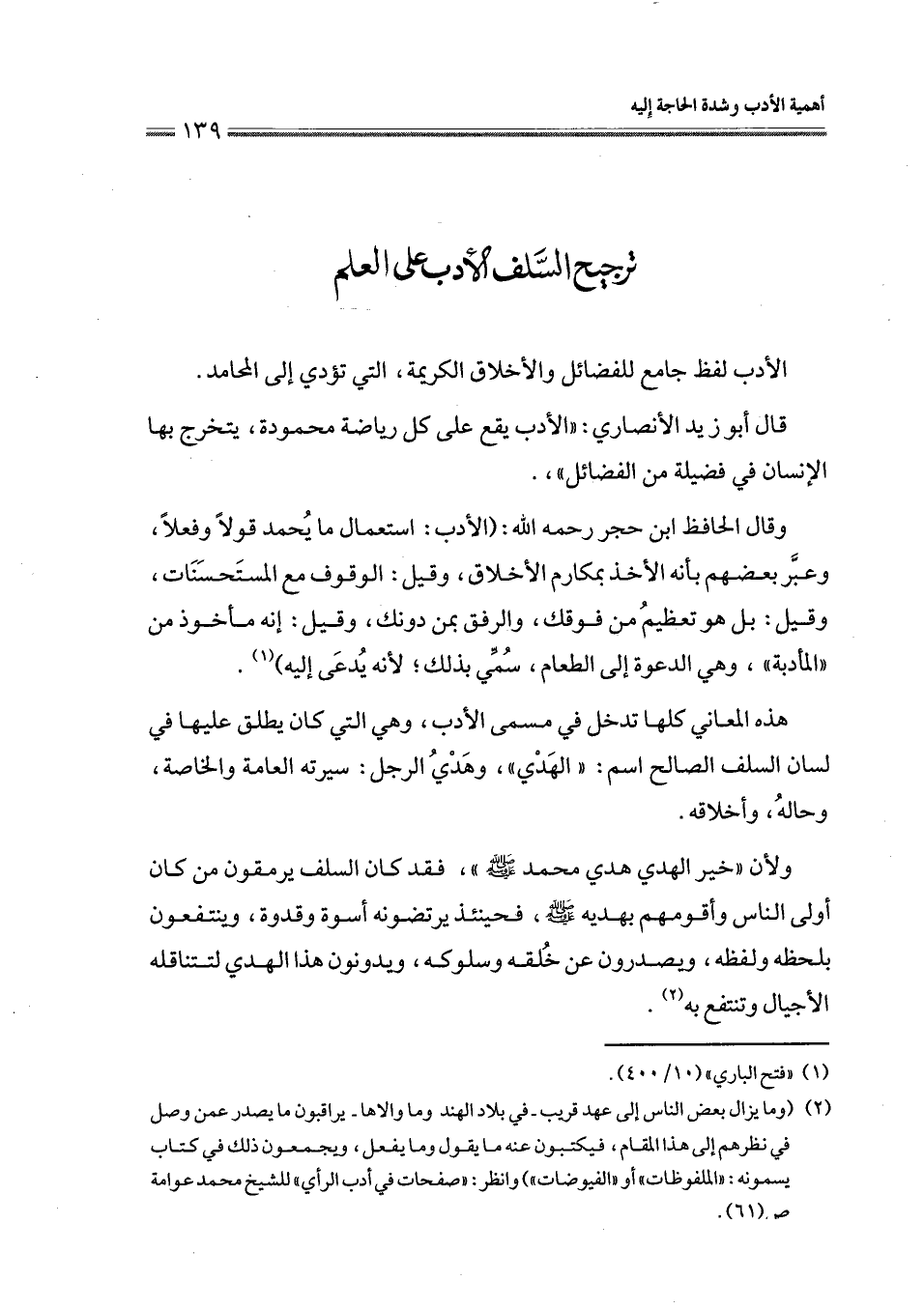 هذه المعاني كلها تدخل في مسمى الأدب، وهي التي كان يطلق عليها في لسان السلف الصالح اسم: " الهَدْي "، وهَدْيُ الرجل: سيرته العامة والخاصة، وحالهُ، وأخلاقه.