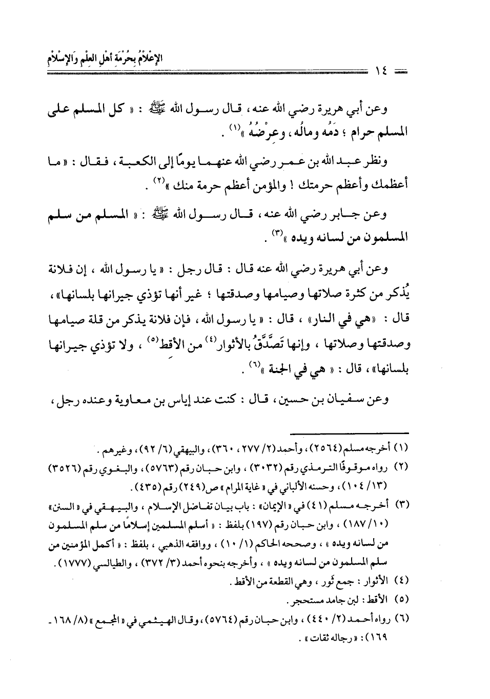 (¬3) أخرجه مسلم (41) في " الإيمان ": باب بيان تفاضل الإسلام، والبيهقي في " السنن " (10/ 187)، وابن حبان رقم (197) بلفظ: " أسلم المسلمين إِسلامًا من سلم المسلمون من لسانه ويده "، وصححه الحاكم (1/ 10)، ووافقه الذهبي، بلفظ: " أكمل الموًمنين من سلم المسلمون من لسانه ويده "، وأخرجه بنحوه أحمد (3/ 372)، والطيالسي (1777).