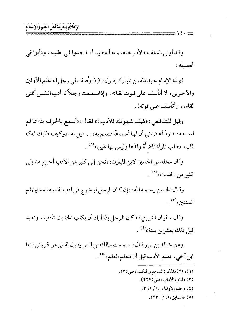 فهذا الإمام عبد الله بن المبارك يقول: (إذا وُصف لي رجل له علم الأولين والآخرين، لا أتأسف على فوت لقائه، وإذا سمعت رجلاً له أدب النفس أتمنى لقاءه، وأتاسف على فوته).