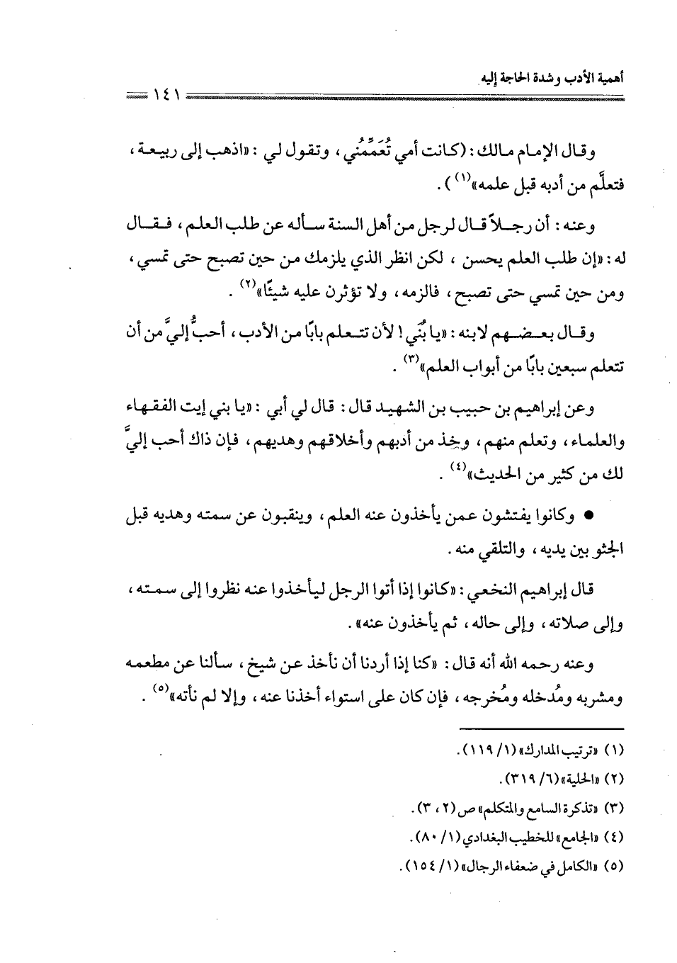 وقال بعضهم لابنه: " يا بني! لأن تتعلم بابًا من الأدب، أحبُّ إليَّ من أن تتعلم سبعين بابًا من أبواب العلم " (¬3).