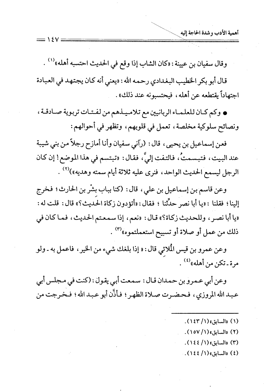 وعن قاسم بن إسماعيل بن علي، قال: (كنا بباب بِشْر بن الحارث؛ فخرج إلينا؟ فقلنا: " يا أبا نصر حدِّثنا؟ فقال: " أتؤدون زكاة الحَديث؟ " قال: قلت له: " يا أبا نصر، وللحديث زكاة؟ " قال: " نعم، إذا سمعتم الحديث، فما كان في ذلك من عمل أو صلاة أو تسبيح استعملتموه " (¬3).