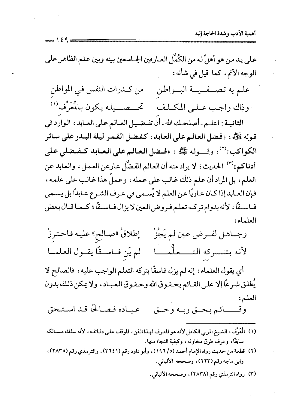 الثانية: اعْلم -أصلحك الله- أن تفضيل العالم على العابد، الوارد في قوله - صلى الله عليه وسلم -: " فضل العالم على العابد، كفضل القمر ليلة البدر على سائر الكواكب " (¬2)، وقوله - صلى الله عليه وسلم -: " فضل العالم على العابد كفضلي على أدناكم " (¬3) الحديث؛ لا يراد منه أن العالم المفضَّل عار عن العمل، والعابد عن العلم، بل المراد أن علم ذلك غالب على عمله، وعمل هذا غالب على علمه، فإن العابد إذا كان عاريًا عن العلم لا يُسمى في عرف الشرع عابدًا بل يسمى فاسقًا، لأنه بدوام تركه تعلم فروض العين لا يزال فاسقًا؛ كما قال بعض العلماء: