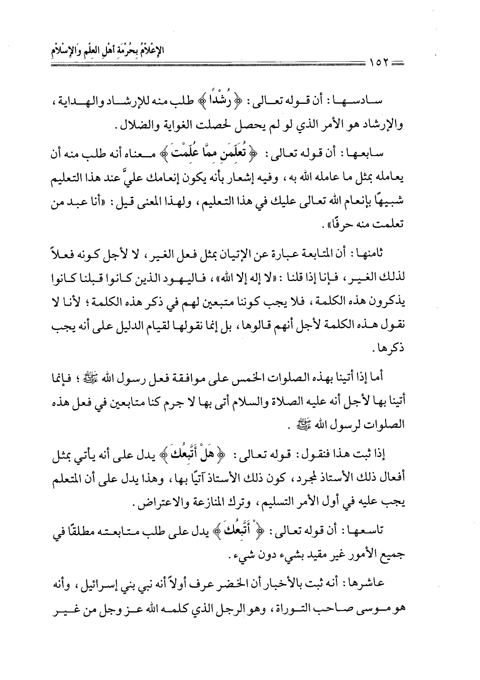 إذا ثبت هذا فنقول: قوله تعالى: (هَلْ أَتَّبِعُكَ) يدل على أنه يأتي بمثل أفعال ذلك الأستاذ لمجرد، كون ذلك الأستاذ آتيًا بها، وهذا يدل على أن المتعلم يجب عليه في أول الأمر التسليم، وترك المنازعة والاعتراض.