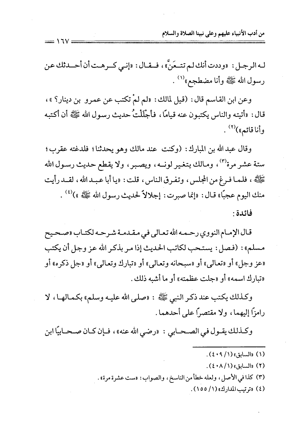 وعن ابن القاسم قال: (قيل لمالك: " لم لمْ تكتب عن عمرو بن دينار؟ "، قال: " أتيته والناس يكتبون عنه قيامًا، فأجْللْتُ حديث رسول الله - صلى الله عليه وسلم - أن أكتبه وأنا قائم ") (¬2)