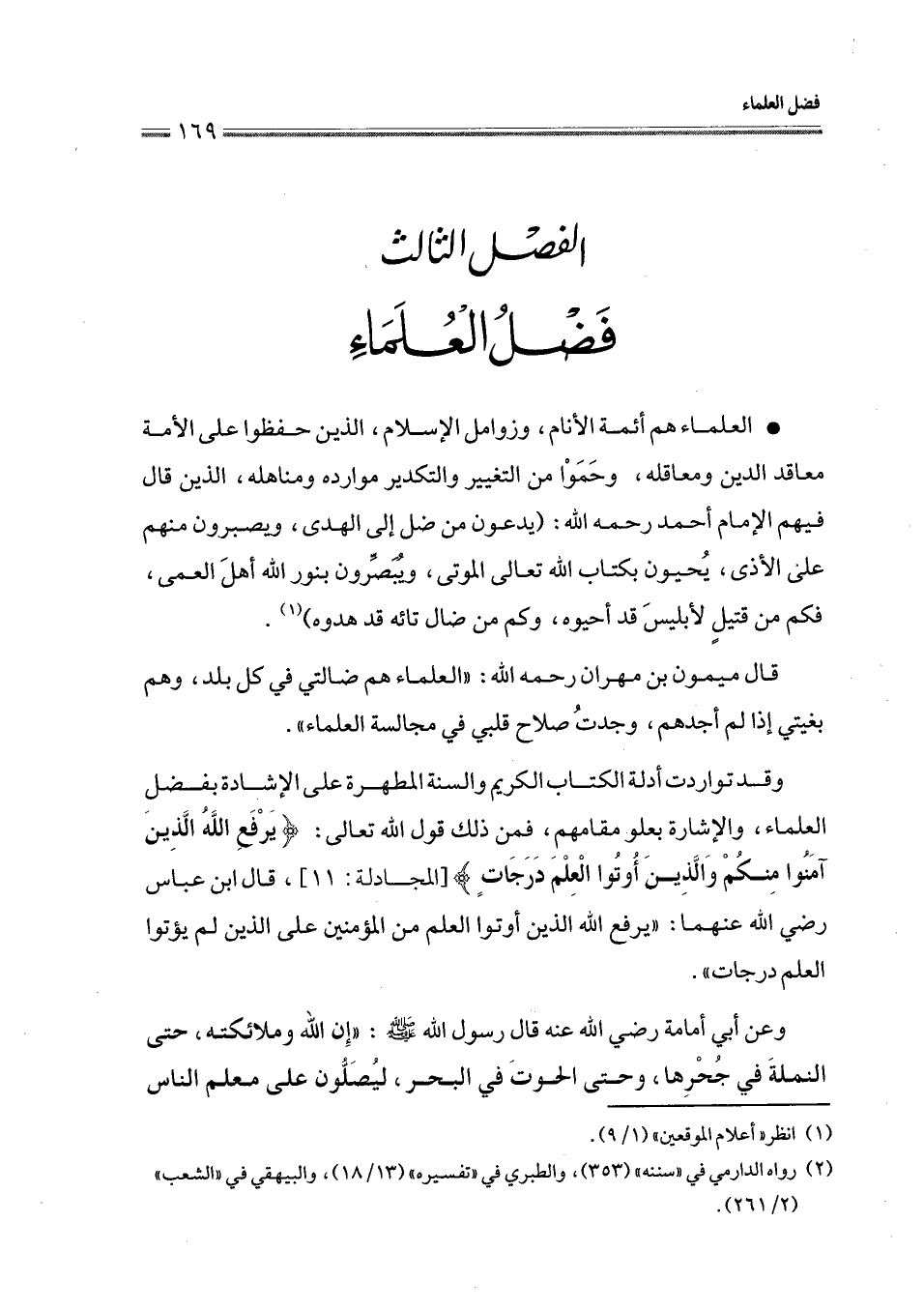 وقد تواردت أدلة الكتاب الكريم والسنة المطهرة على الإشادة بفضلِ العلماء، والإشارة بعلو مقامهم، فمن ذلك قول الله تعالى: {يَرْفَعِ اللَّهُ الَّذِينَ آمَنُوا مِنْكُمْ وَالَّذِينَ أُوتُوا الْعِلْمَ دَرَجَاتٍ} [المجادلة: 11]، قال ابن عباس رضي الله عنهما: " يرفع الله الذين أوتوا العلم من المؤمنين على الذين لم يؤتوا العلم درجات " (¬2).