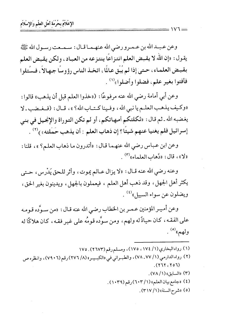 وعن عبد الله بن عمرو رضي الله عنهما قال: سمعت رسول الله - صلى الله عليه وسلم - يقول: " إِن الله لا يقبض العلم انتزاعًا ينتزعه من العباد، ولكن يقبض العلم بقبض العلماء، حتى إِذا لم يُبق عالمًا، اتخذ الناس رؤوسًا جهالاً، فسُئلوا فأفتوا بغير علم، فضلوا وأضلوا " (¬1).